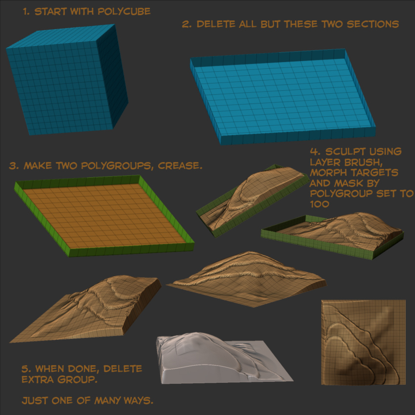 Another thing you can do is sculpt on top of a cubically tesselated cube (a polycube) after making the top surface a seperate polygroup from the other five sides. Then when done sculpting, delete the other 5 sides leaving you with only the top. Then you can take that and flatten it out on each side using “Flatten” in the Deformation palette.