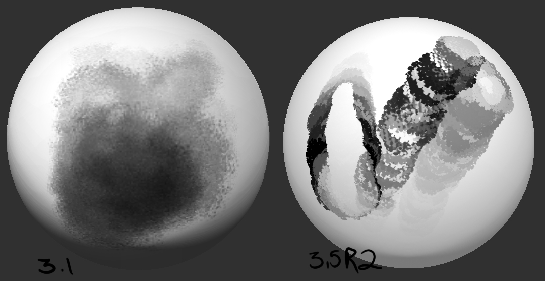 Im still trying to get used to R2 and all the new features and options. One thing Ive run into thats different is painting with the layer brush. In 3.1 the layer brush with alpha 07 or alpha 08 worked amazing for painting fleshy areas and blending colors. In 3.5R2 it seems to have changed alot, the brush has much more hard edges and seems difficult to control. The image should help to explain what I mean. The sphere, brush intensities and alphas were set to be the same in both 3.1 and 3.5R2 for this image.