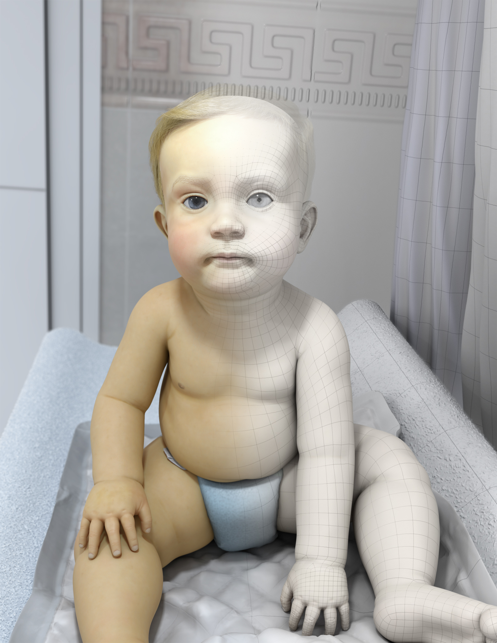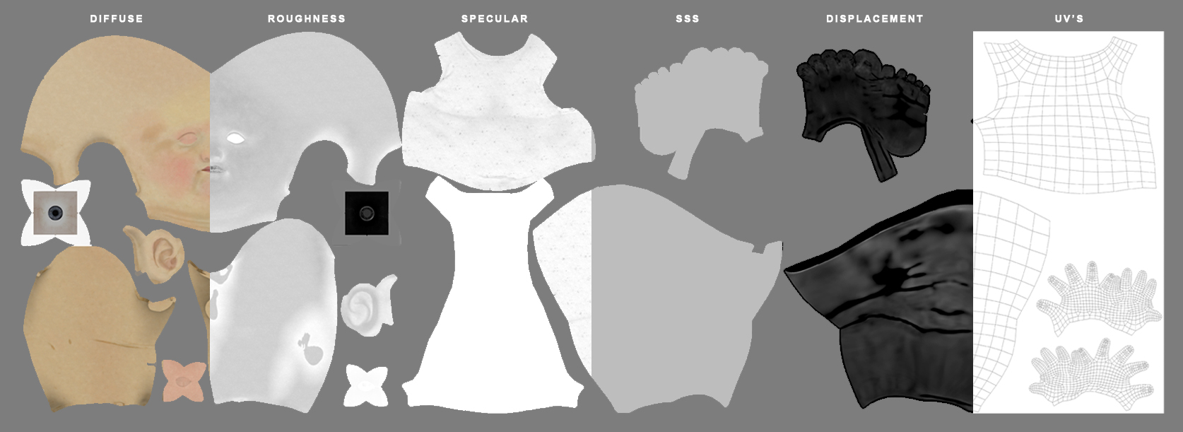 The development of the base mesh and the retopology were made it in Maya, the biggest part of the modeling was realized in ZBrush. For the texturing I used Mari. I come back to Maya with all the model in a medium subdivision of the mesh and with all needed textures for apply the hair with XGen and afterwards make the render with Arnold. The edition of the images was made it in Photoshop.