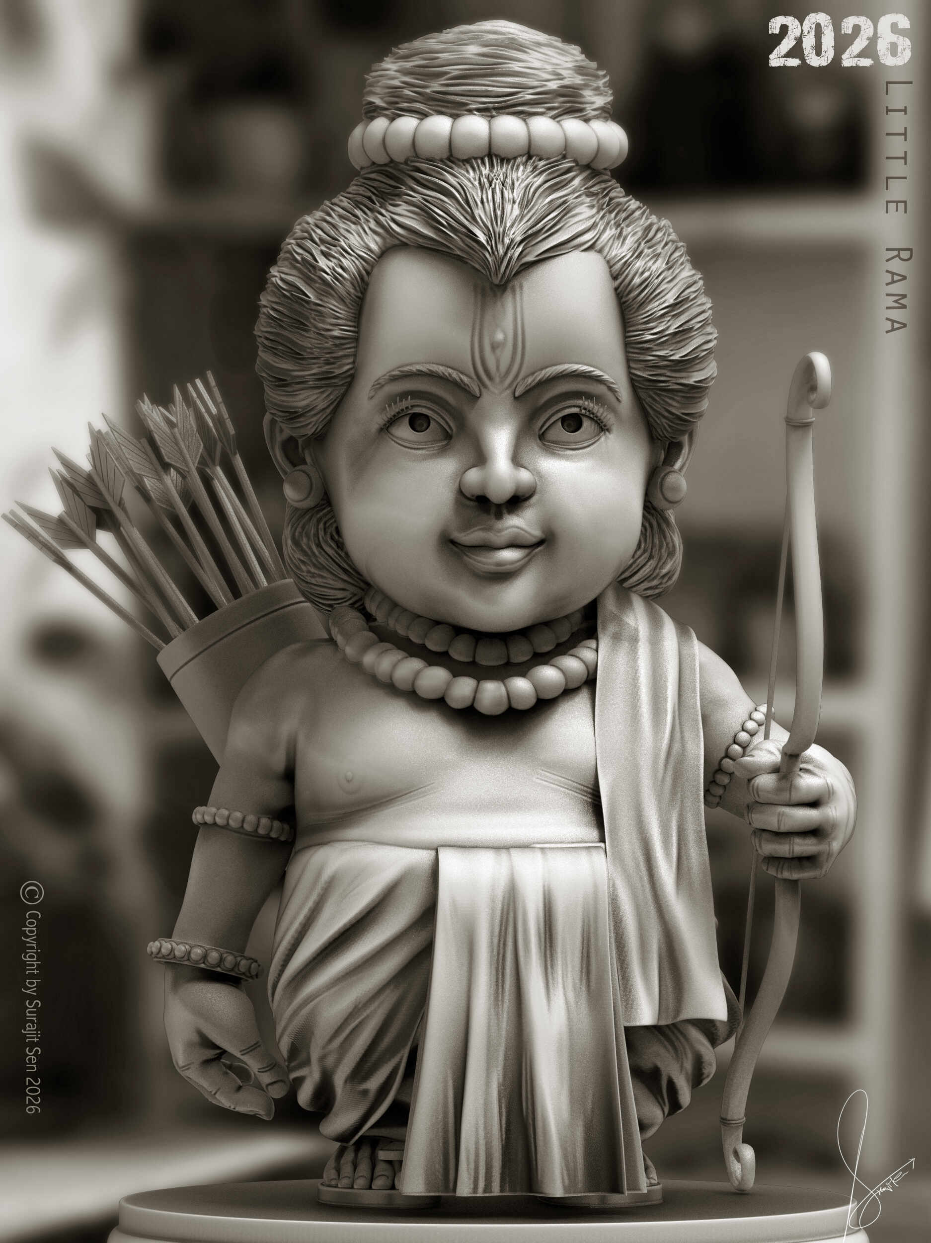 “Little Rama” is envisioned as a gentle and devotional interpretation of Lord Rama, expressing divinity through the innocence of childhood.
