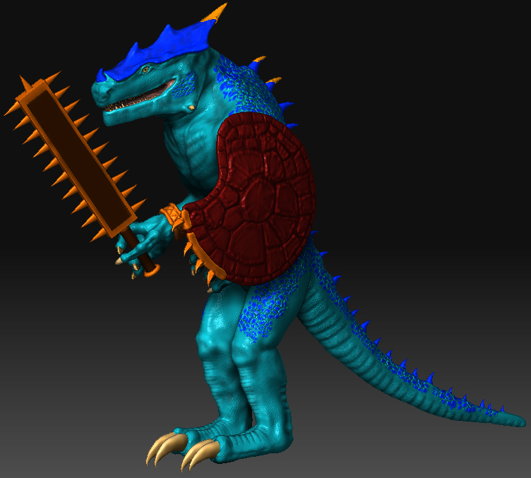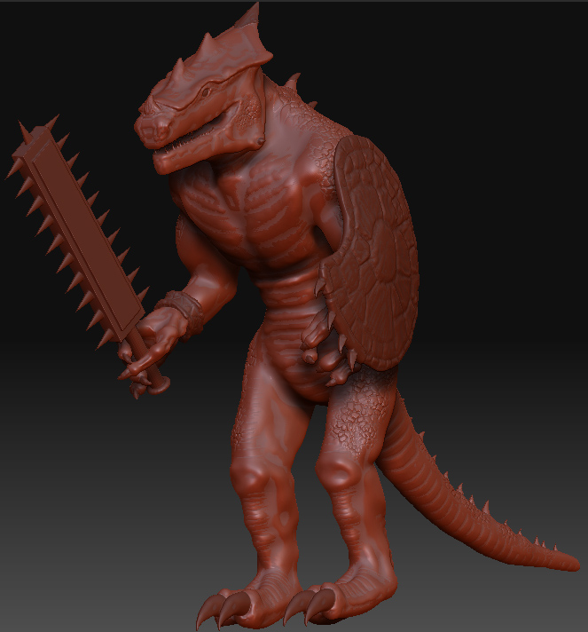 Hey guys heres a wip of a lizardman Suraus Warrior derived from the warhammer universe that im working on. Ive still got parts to add in like the eyes and spikes but i need some advice on the proportions and shape of the muscles. Also i have tried to make the round turtle shield but i can get one with good geomerty, any help would be great.