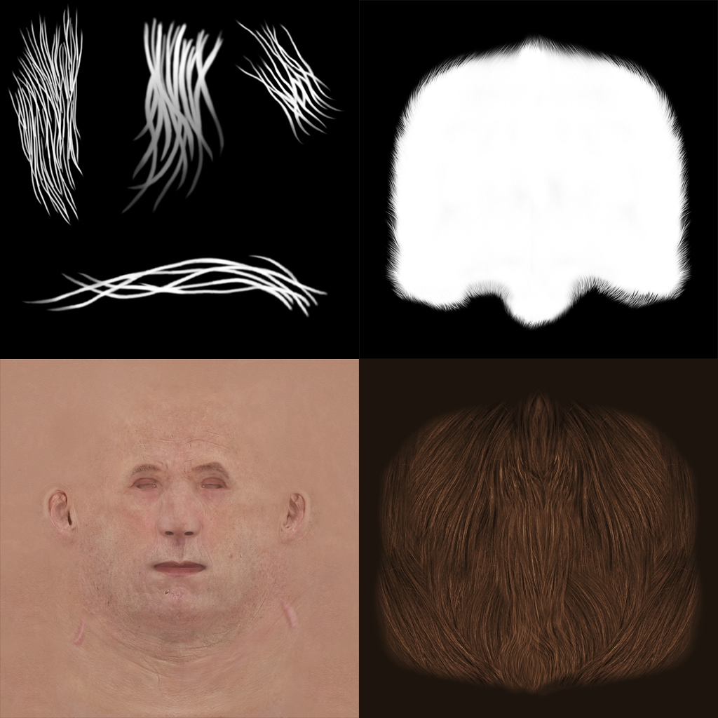 Here are textures of face and hair, the color map of face is very simple and flat. Hair texutre is based on photorefs, as for alpha channel, they’re handpainted.I’m not familar with any fur or hair function