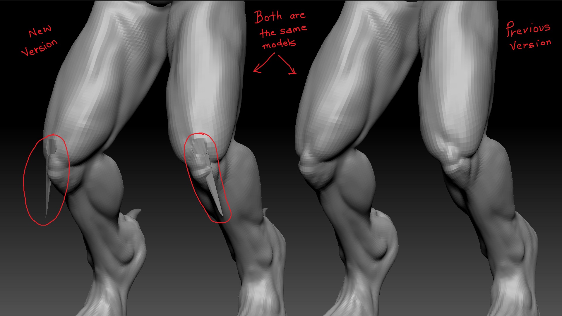 The image below shows two models, with just changes made to the feet, The knees are exactly the same saved just minutes before sculpting on the feet. Is there anyway to transfer the details from the older mesh to the new mesh just on the particular area of the knee so that the mesh goes back into place? The old model does not have the problem of the mesh being screwed up.