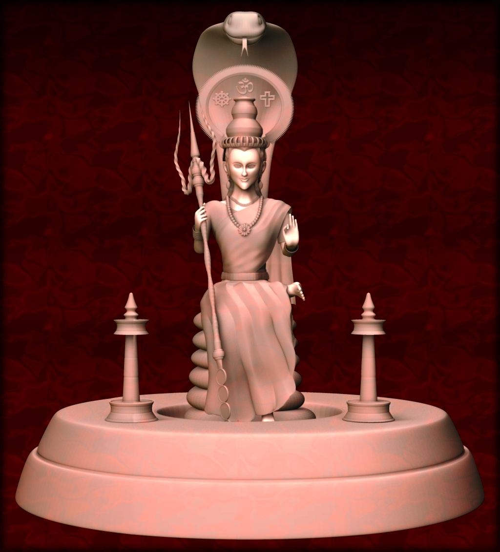 This is a sculpture of Mother Adi Parasakthi. I modelled the low polygon version in Maya and then put in the details in ZBrush. Mother’s model is 470,000 polygons approximately. On my system, ZBrush can support a maximum of 500,000 polygons per sub-tool and putting all the sub-tools together, about 1 million odd polygons can be supported to the point of hanging my system and crashing Zbrush every 15 to 20 minutes. :lol: