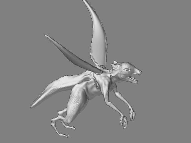 As for wings … well, it all depends what you want. You could use alphas or just paint and gouge out the detail you want. But insect wings are pretty fine, so that would be difficult. Another way is to remove the wings he does have and make some from scratch. The advantage of this is that you can make them evenly thin/flat with little effort. I attach a little ZScript that’ll show you one way of simply painting the wings you want, then turning them into 3D. You could then add them to your model using the Multi-Marker tool.