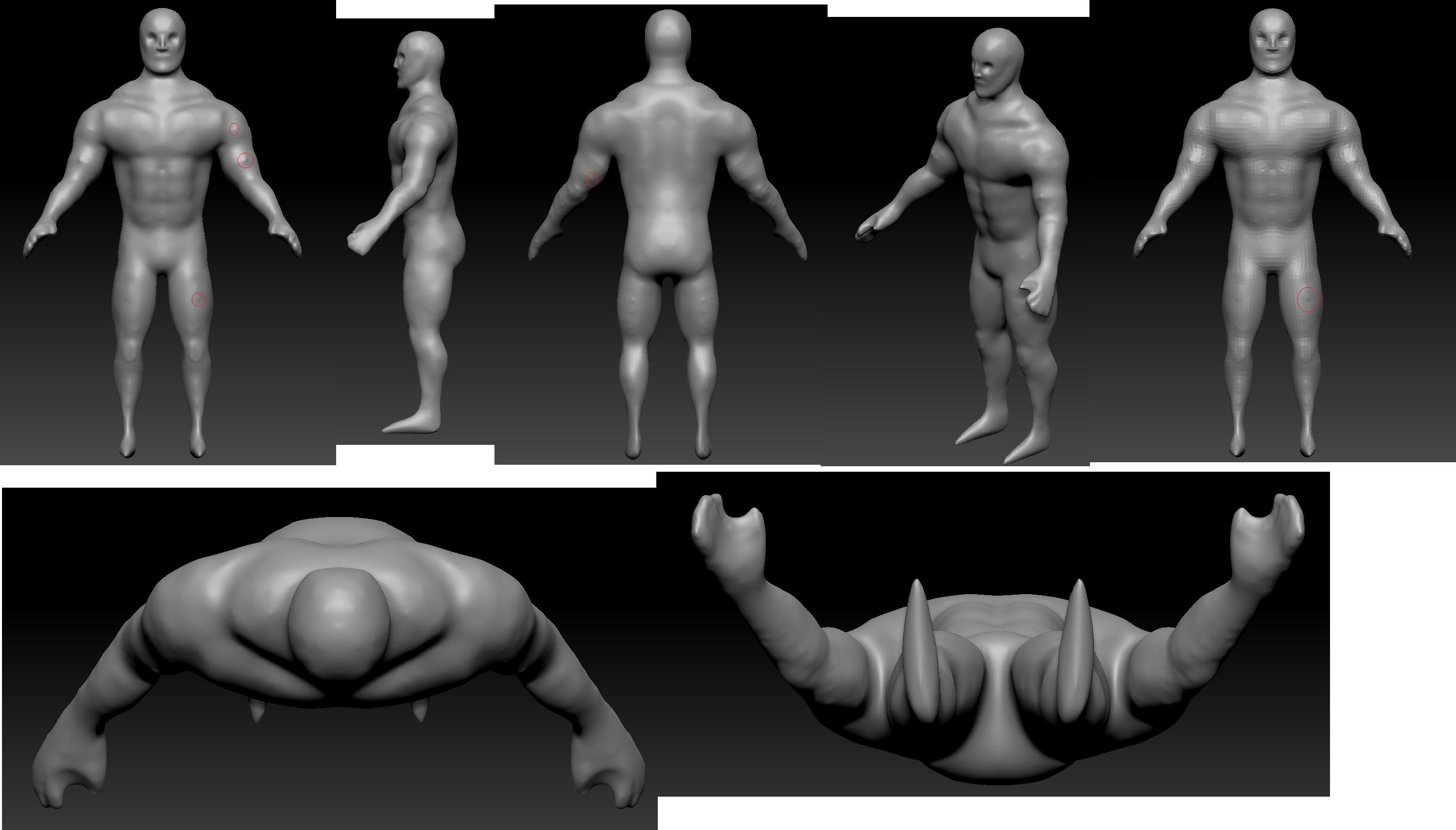 I started the model with ZSpheres to create the basic skeleton, then I added the ZSketch Spheres (I think that’s what they’re called?) to the skeleton to bulk it up a little, then I hit ‘A’ to make it a mesh? (I’m starting to lose myself here…), and I started sculpting on it from there, starting at the lowest subdivision level.