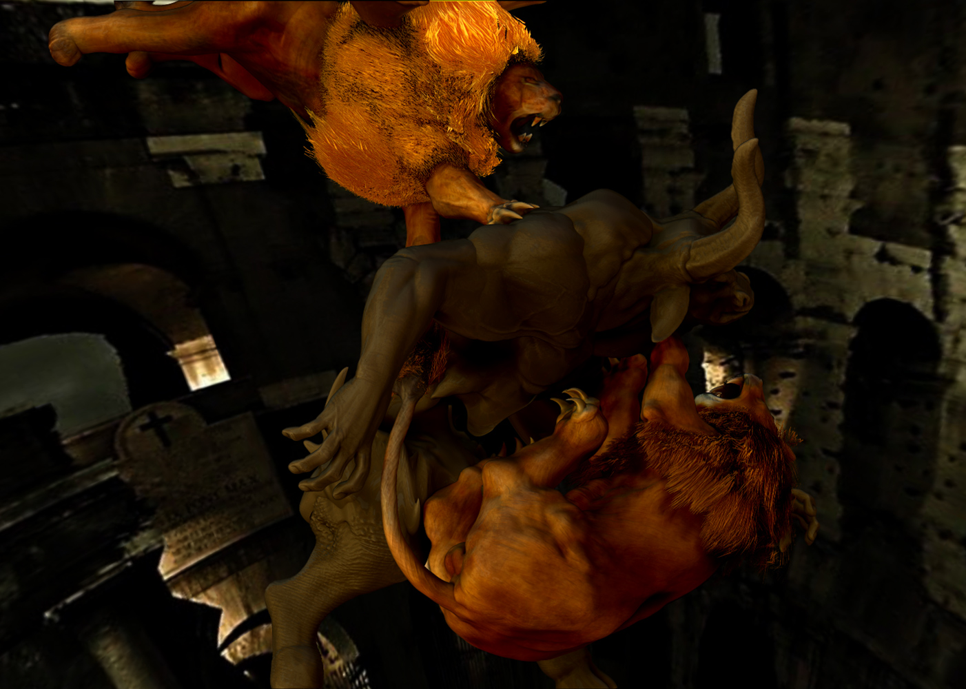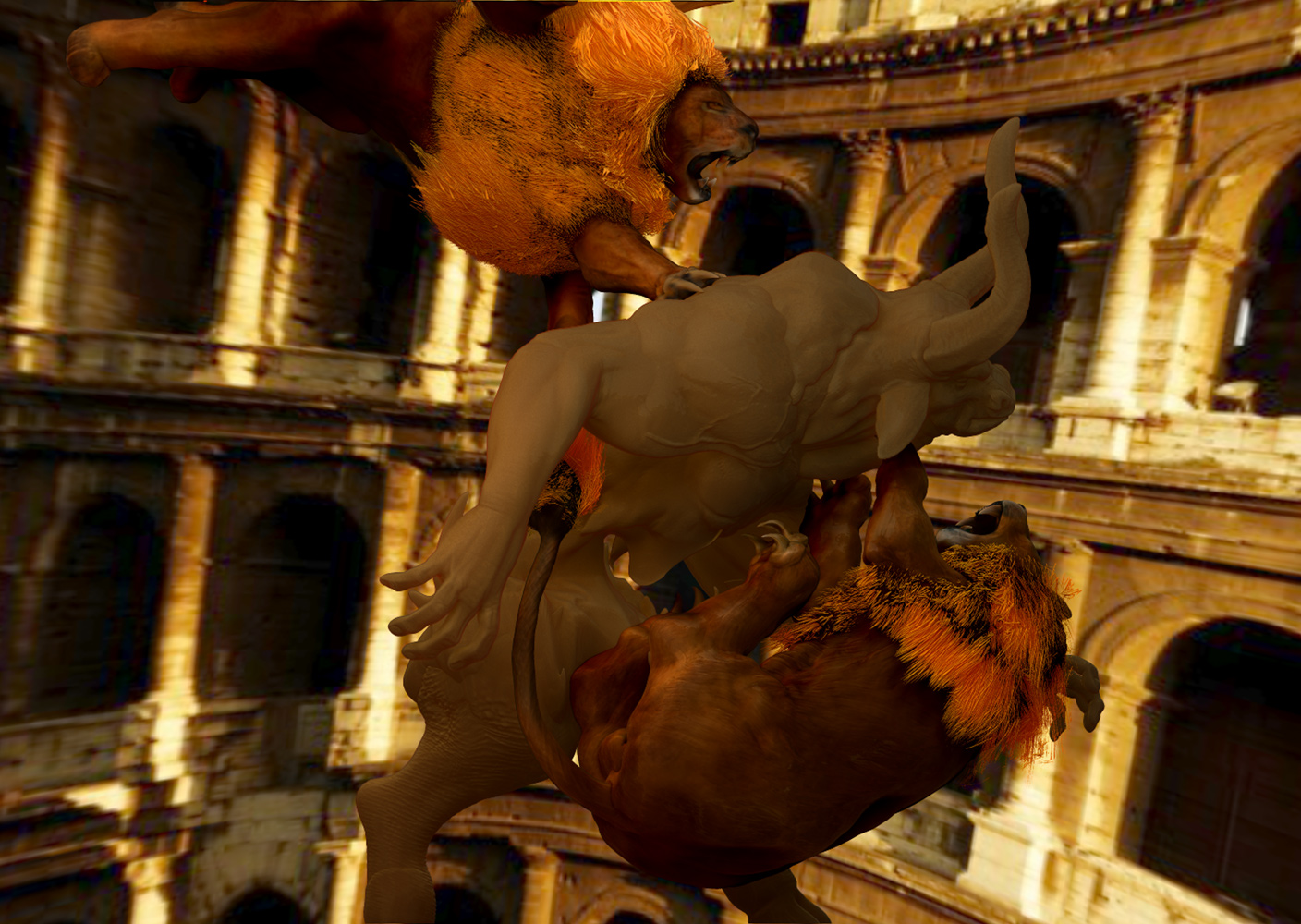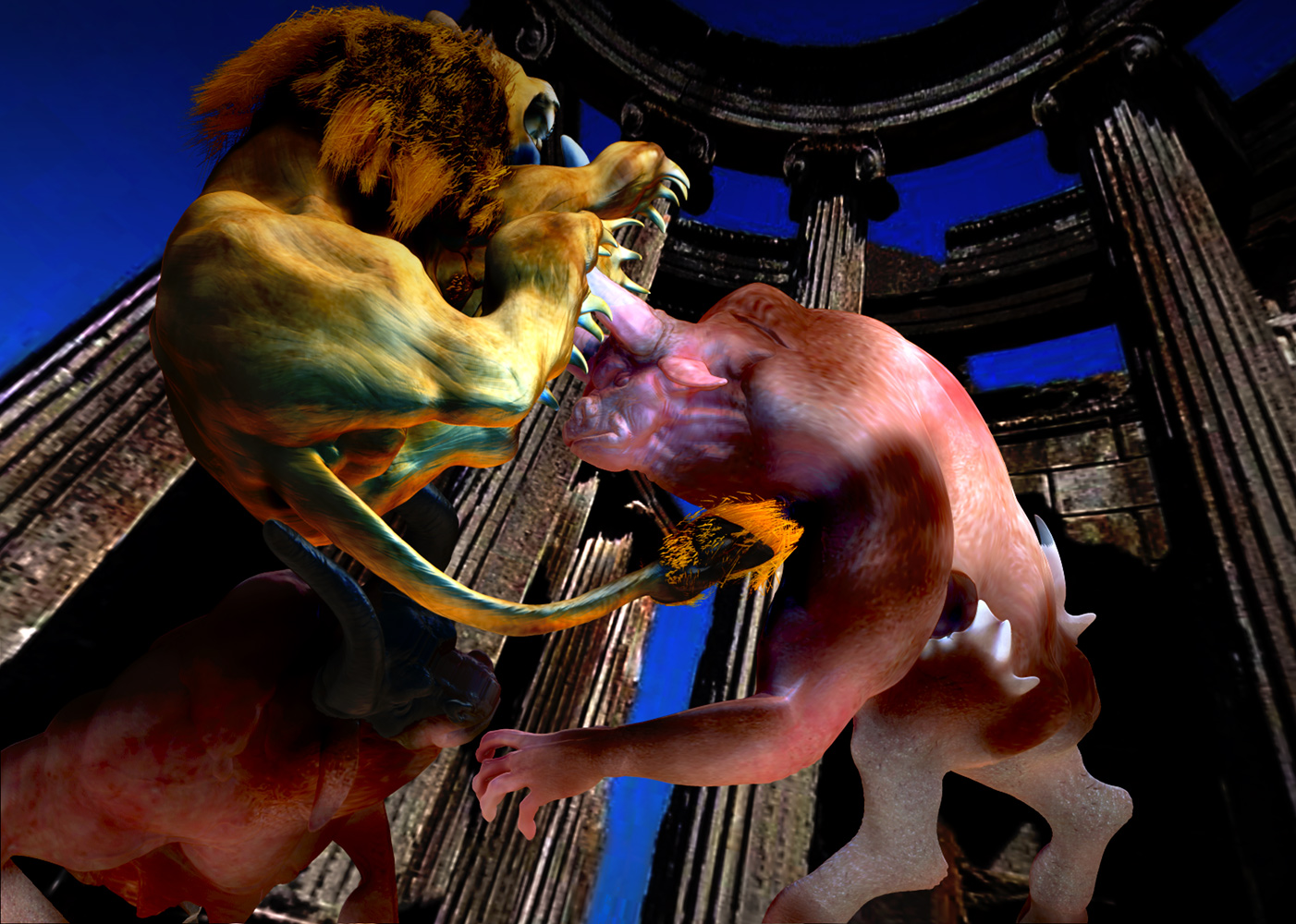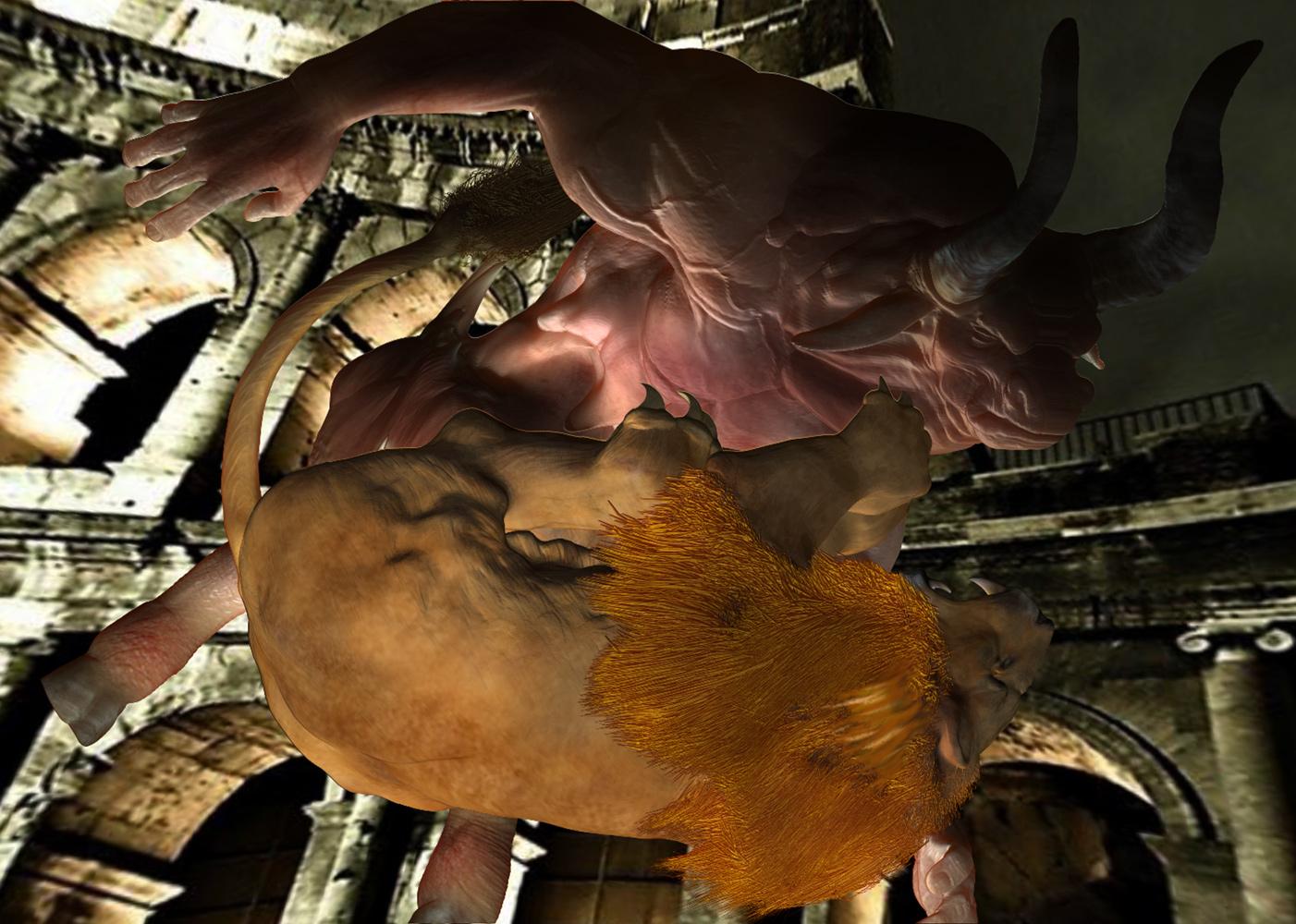 Xexex…Thank you:)…The credit for the sculpting skills should really go to the BadKings body parts package in the ZBrush IMM Brush repository…I used them to create the bull character…the pillars and stairs found in that repository also…can’t remember who created them at the moment…but they are great to work with…:)…I did sculpt and paint the lion from scratch thought…