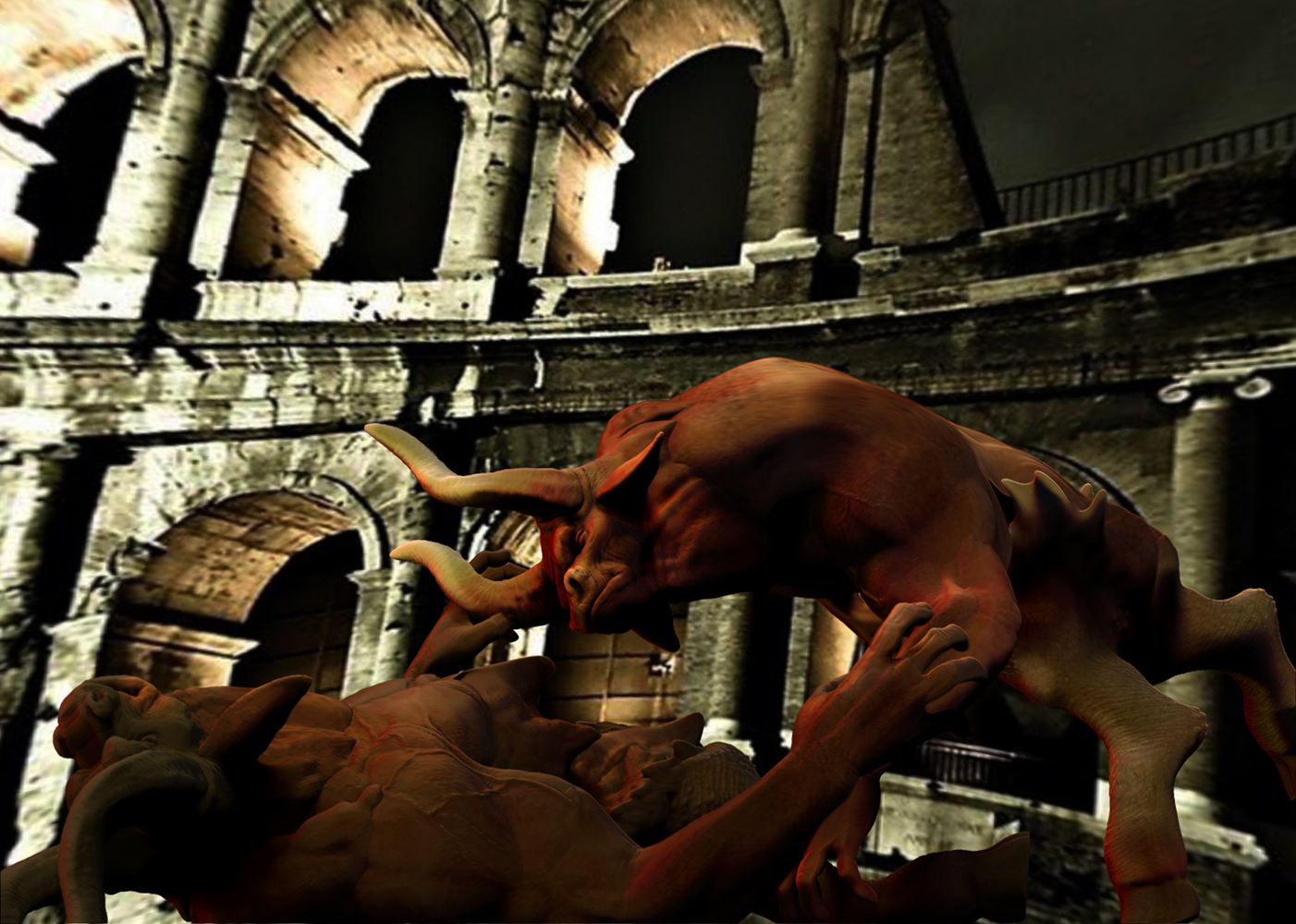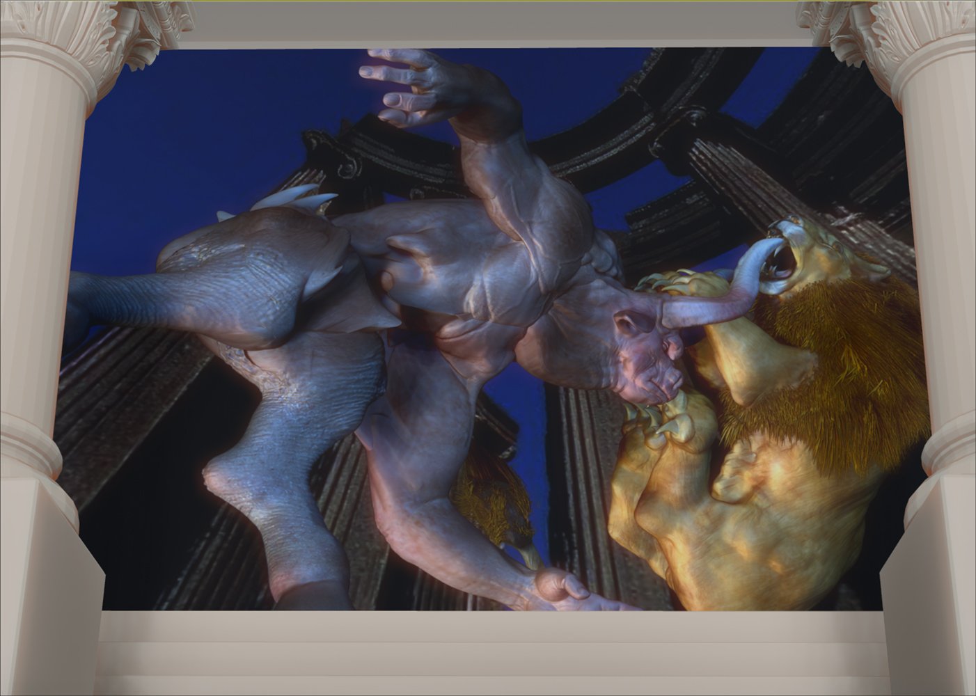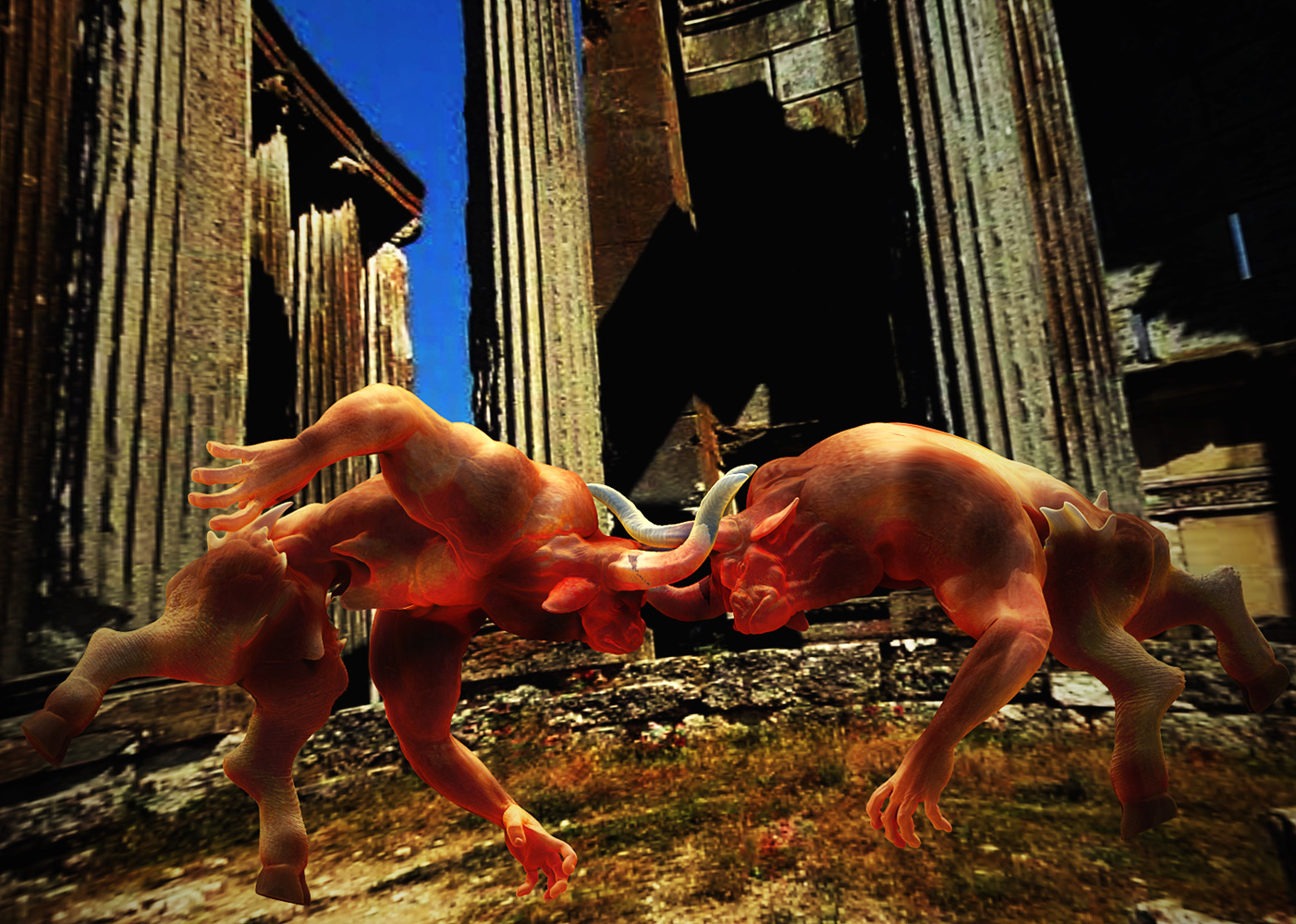 Xexex…Thank you:)…The credit for the sculpting skills should really go to the BadKings body parts package in the ZBrush IMM Brush repository…I used them to create the bull character…the pillars and stairs found in that repository also…can’t remember who created them at the moment…but they are great to work with…:)…I did sculpt and paint the lion from scratch thought…