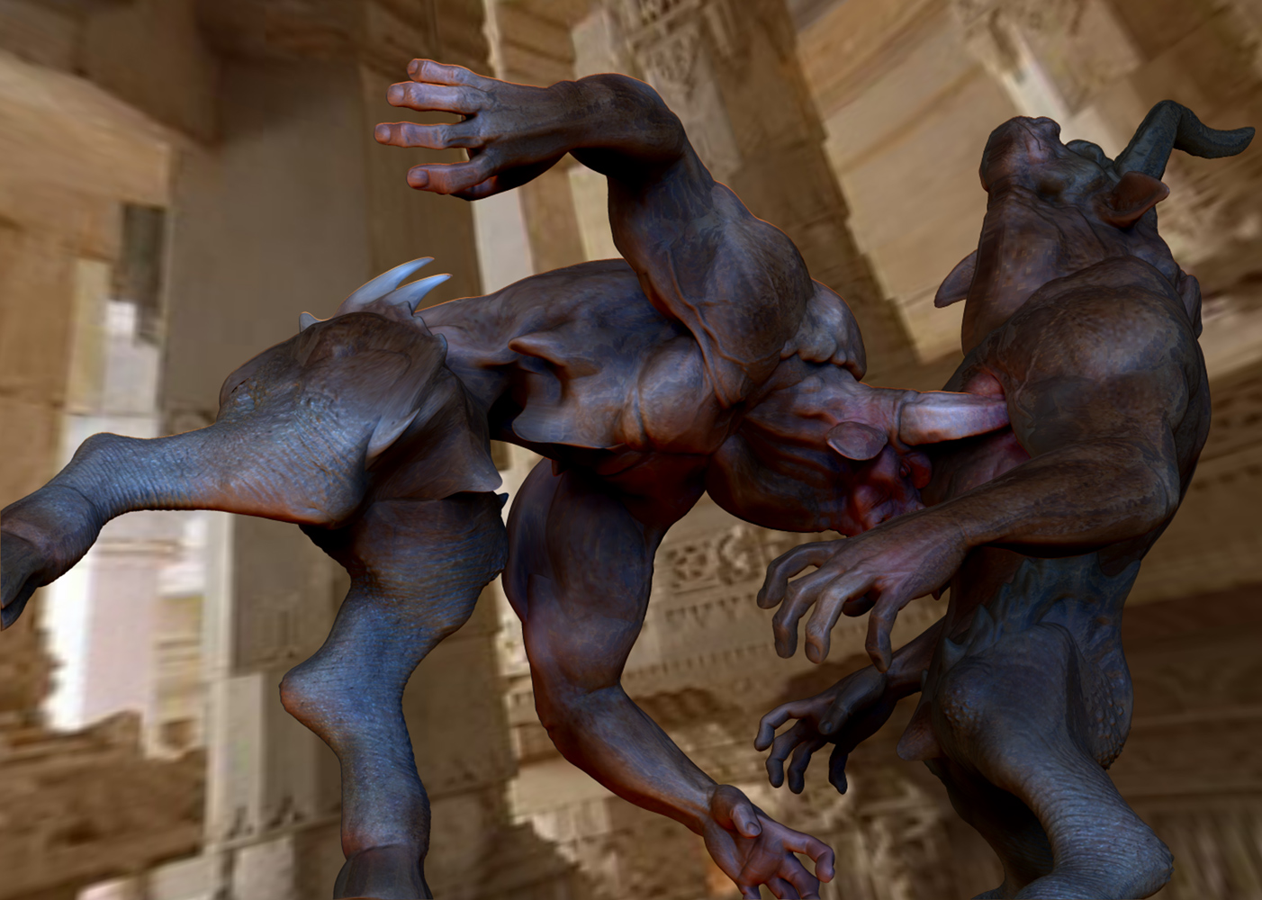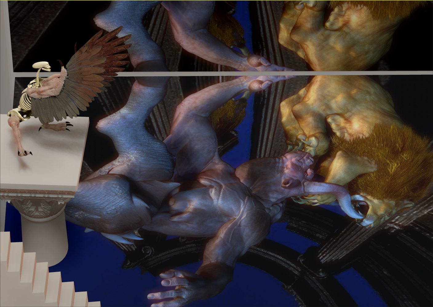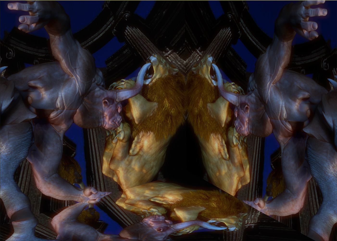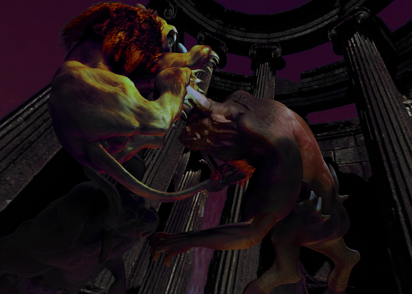Xexex…Thank you:)…The credit for the sculpting skills should really go to the BadKings body parts package in the ZBrush IMM Brush repository…I used them to create the bull character…the pillars and stairs found in that repository also…can’t remember who created them at the moment…but they are great to work with…:)…I did sculpt and paint the lion from scratch thought…