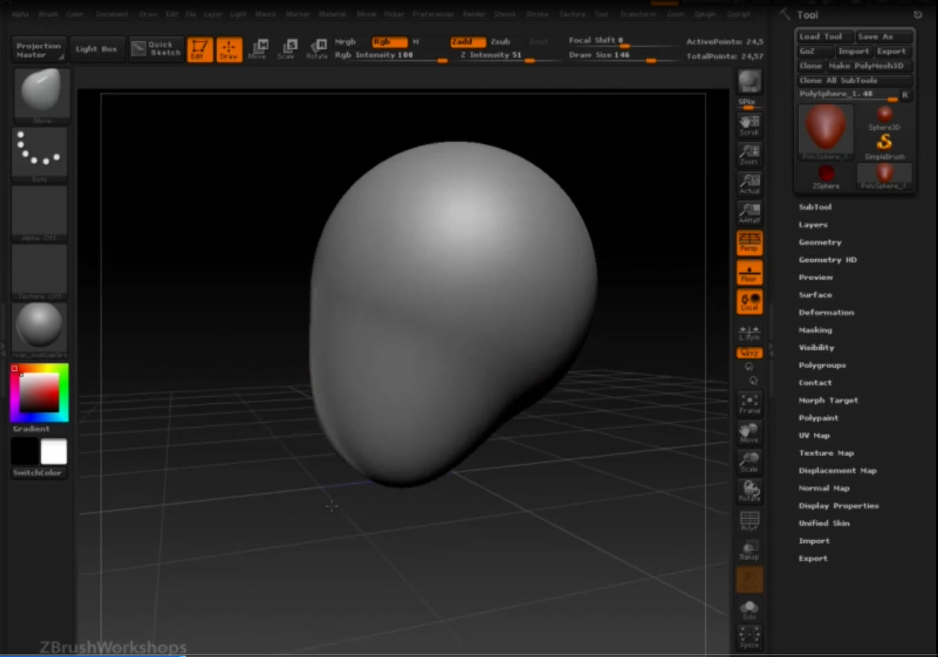 i have Zbrush Workshop for Zbrush 4 and i stuck with the second video with 2 - Sculpting - Move Brush Would like to help me hot to create this one.I will send you mine and the from the video how looks like this is from the video