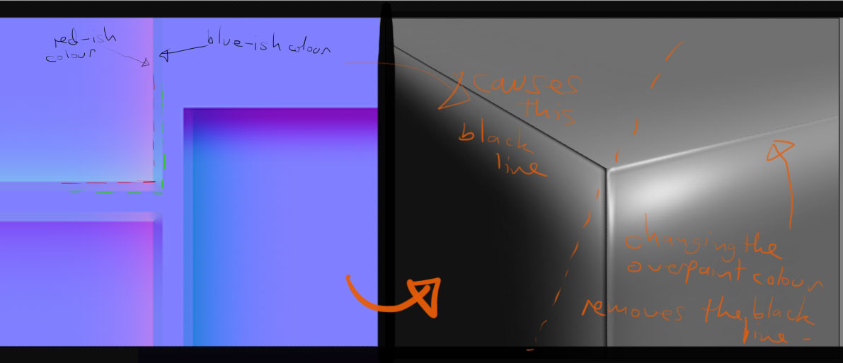 - this strange “raised” area of the normal map that appears at the edge of the mesh.