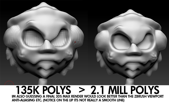 the first model i made in ZBrush was a similar start to this, but i went more in depth in my sculpting (learning the brushes n tools)…i turned it into a cartoonish grandmother type figure (long chin/ponytail and even some alright looking hair)…and thats when i first encountered the problem that my model wasnt looking as smooth as i wanted…even after subdividing it wasnt looking like your models i see around here (very very very impressive)…