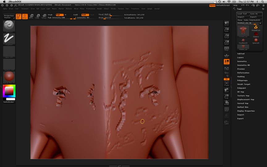 One thing I’ve noticed about my model is that though I welded the seem of the model in 3DS, once I start bumping up the geometry in ZBrush, a few gaps have produced themselves along the original seem. Could that be causing the symmetry problem I’m having? Any thoughts on how I can fix that problem too?