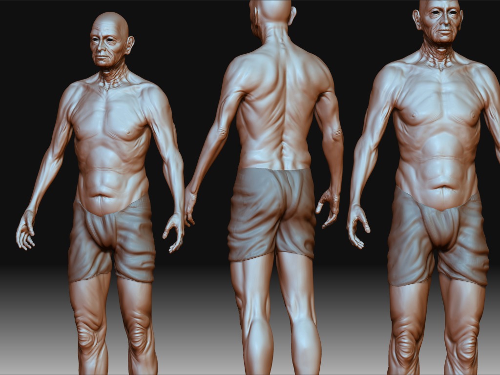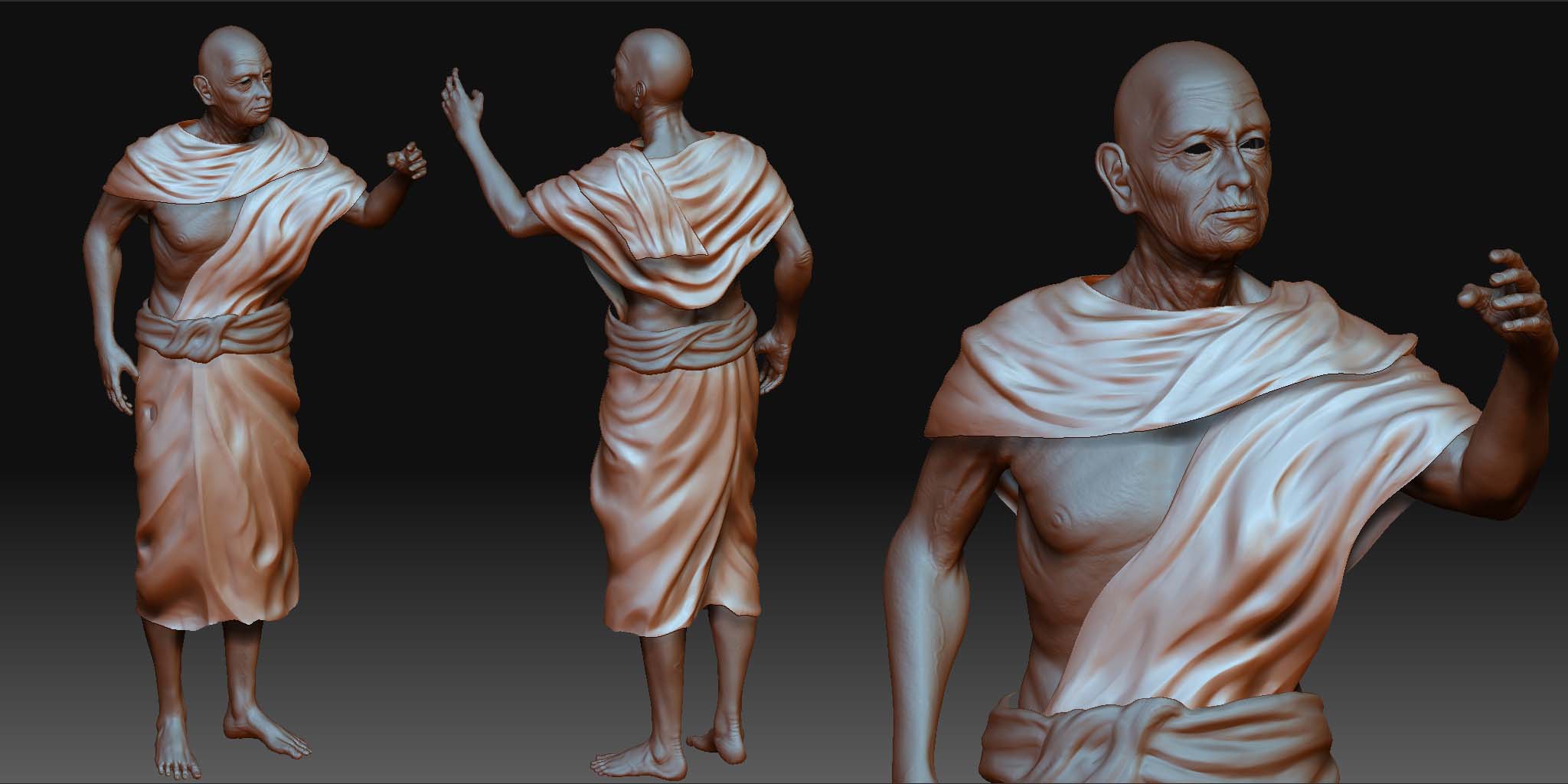 hey, great work. you really make him look real and believable. one crit. i think the seams of the cloth are to thin compared to the way it wrinkles. do you know what i mean. like, the way you have it wrinkling implies a thicker more rigid cloth, but the thinness of the seams or the edges imply a looser thinner fabric. like it should hang more like silk. i think youre going for something closer to heavy wool, burlappy, starchy. just a suggestion. but great sculpt man. seriously.