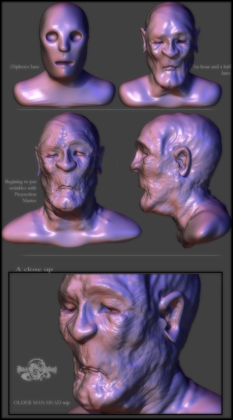 let it freak, im not using alphas, im using the deco brush and smoth tool in proyection master, thats way faster to make wrinkles, and thanks for ur comments all of you guys, ill be posting new updates soon.