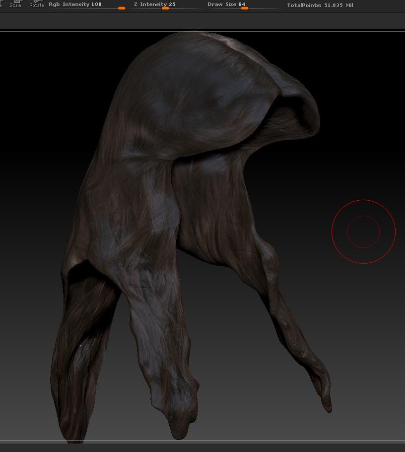 Now i’m working on the second tool in the model (the hair). I’ve imported a UV mapped obj into zbrush (basically the subD1 exported to max, uvmapped then reimported to add UV maps to the mesh while retaining all the subD levels). I then polypainted it and got it to a point where I want to export the model.