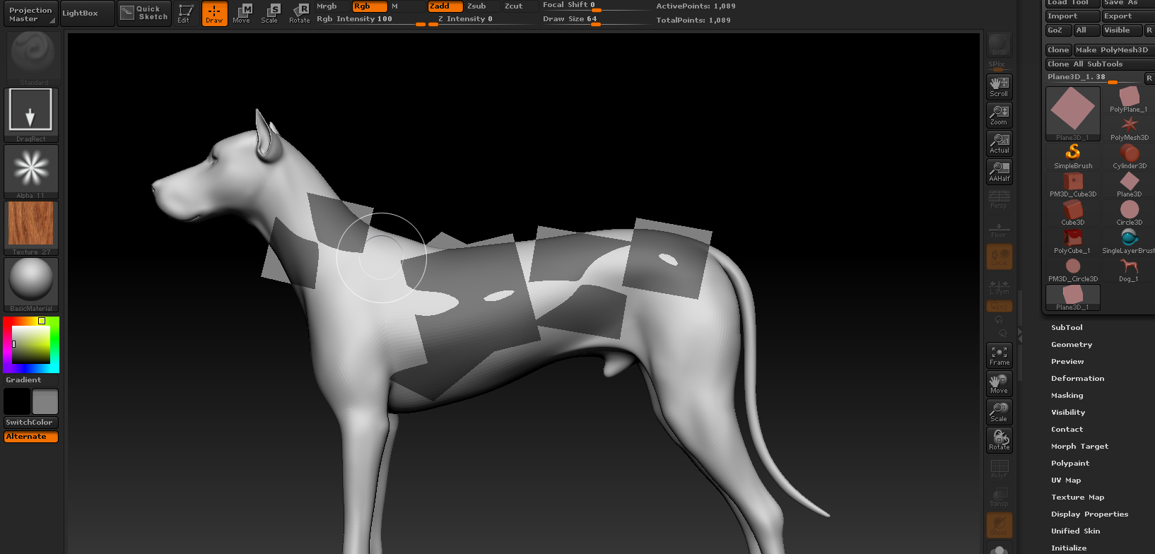 So this is just to explain why I turned to projection master instead and amazingly this works really well, i doubled the original texture with a clone, giving me amazing detail with project master. But there is one thing I am missing terribly, when polypainting I tend to use the standard brush in RGB mode with drag rectangle stroke to drag alpha’s onto the model in fast succession and rotating them along the way by just holding left mouse button and moving. However when using projection master I can’t rotate with any of the brushes and draw rectangle stroke. It only seems to work with dot or freehand, but this isn’t ideal , because in that case i’m still missing the on the fly scaling. This slows down my process of texturing a lot. Is there a way to get this behaviour I love so much in polypainting into projection master?