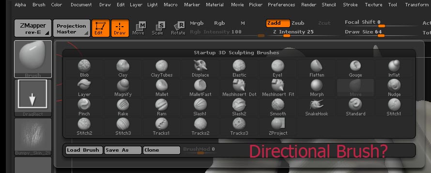 When you have dropped a model with PM, it is no longer in Edit mode. Therefore, you can’t use the contents of the Brush palette. Instead, you use the various features in the Tool palette, which includes the Directional Brush.