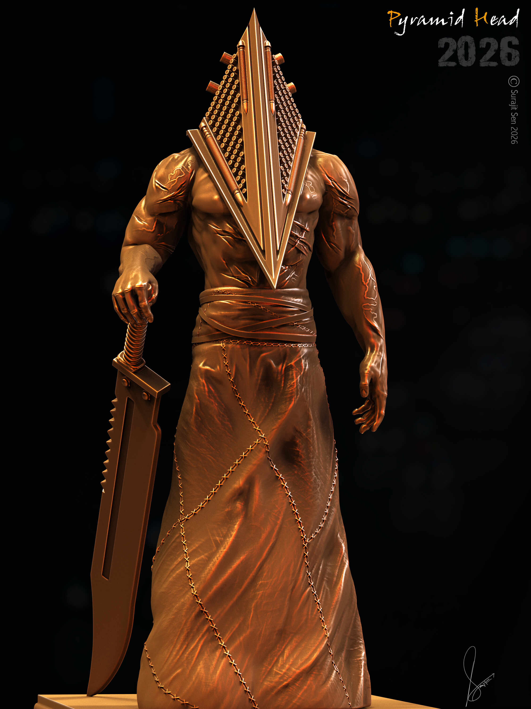 This digital sculpture embodies my personal interpretation of one of my favorite characters, Pyramid Head, inspired by the universe of the Silent Hill series. Through this work, I explore darkness as both a tangible form and a psychological force. I sought to capture the unsettling aura of guilt, fear, and punishment that defines the character, presenting a fusion of brutality and psychological horror. In my version, I reinterpret this iconic figure while articulating my own vision of dread and inner torment. The sharp geometry and metallic textures symbolize retribution and anguish. My focus was to embody raw fear, power, and an unyielding, relentless presence within a single, commanding form.