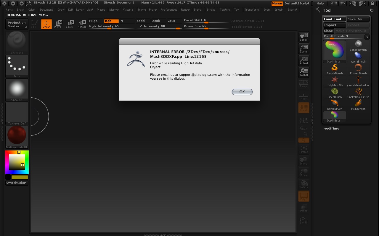 i was having a problem where i couldn’t paint with Standard Brush until i cleared the screen with a fresh launch. So, i deactivated and just installed 3.12 all over again,reactivated, placed 3.12B in the folder, and then trashed the original ZBrushOSX.app and the problem was fixed… so it might work for your problem. It probably had to do with some preference i had set. but anyway it worked… and you don’t have to keep the original ZBrush OSX app (keep the folder(s) of course)… it just wastes space from all i can tell.