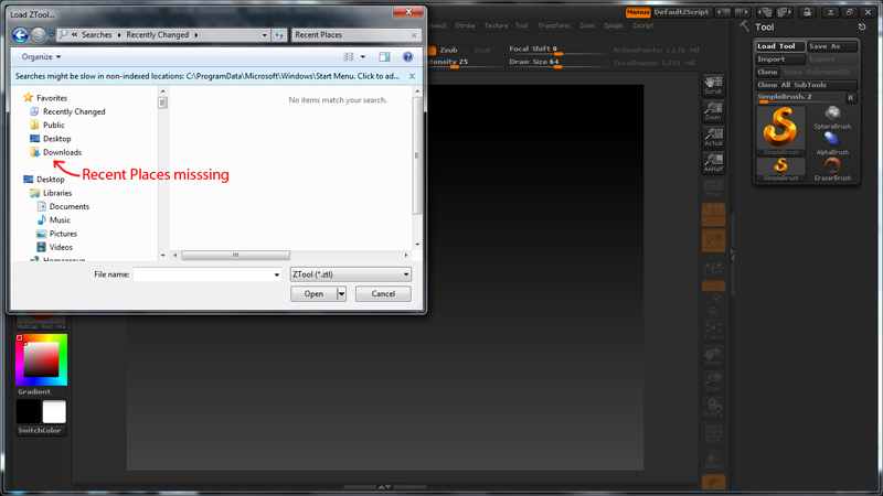 In the load or import options i did something by mistake and moved or deleted the Recent Places and i can’t seem to get it back (tried Initialize ZB and Restore to Standard UI Config and also even tried searching the Recent Places from search in the open window and it said it doesn’t match searches!!!). How could i get this aspect back in the load/import window??
