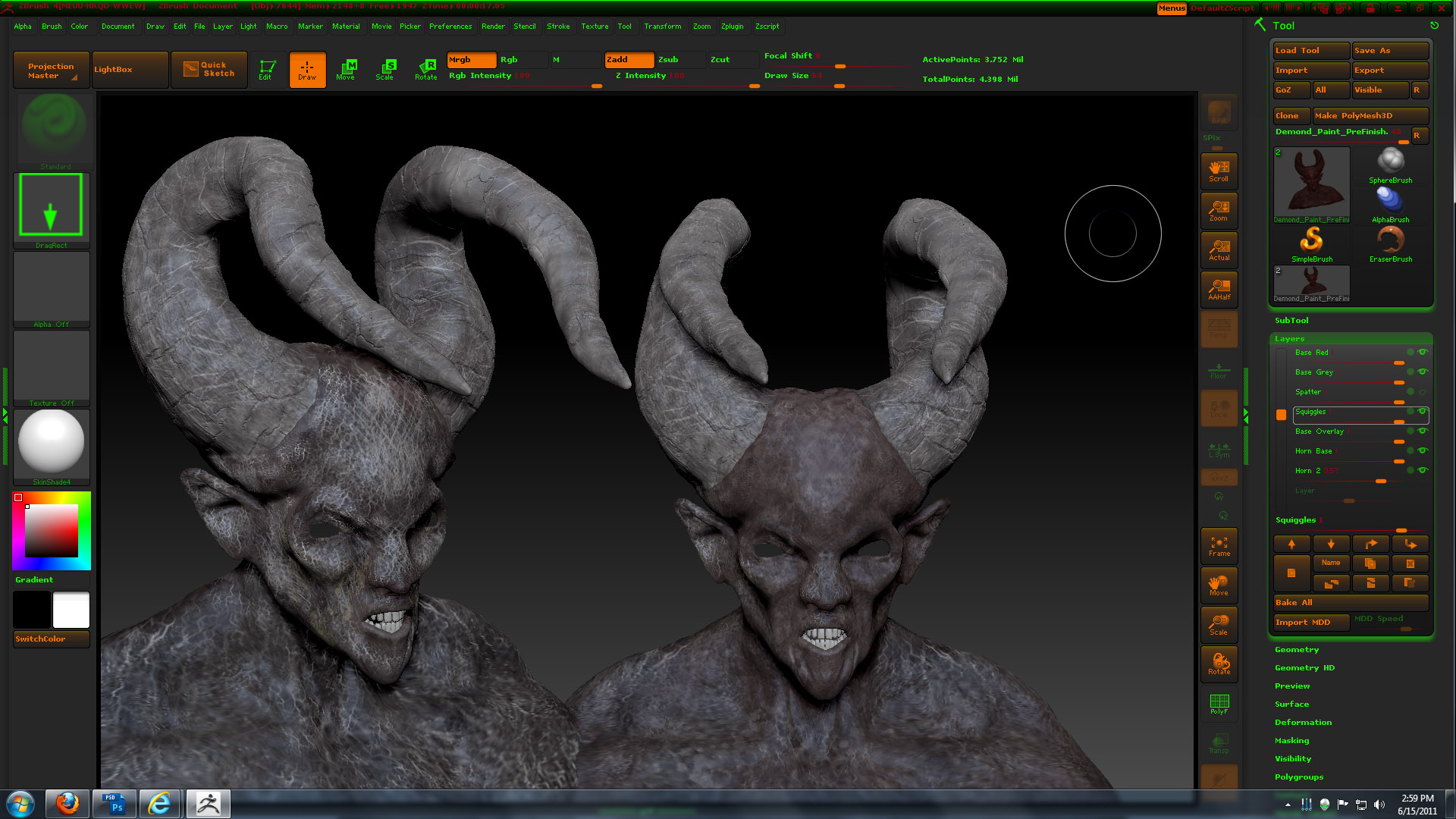 P.S. I should have used the skin Mat to begin with, so the horns are OK but not done. The body is not at all the color I intended it to be. Wrong Matcap, I’ll fix it.
