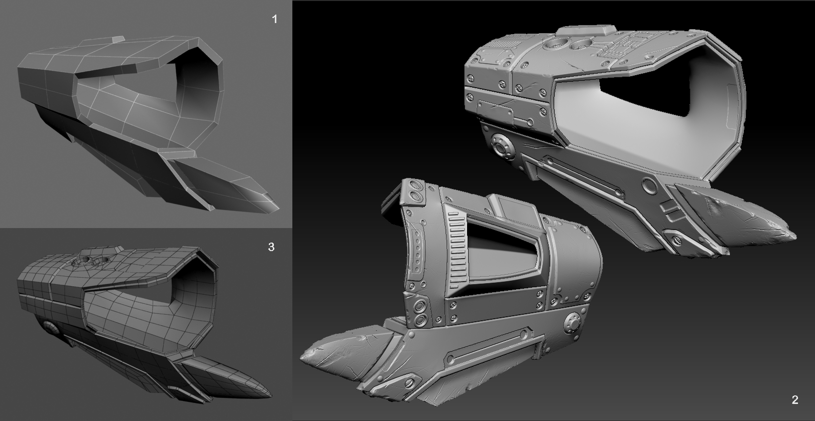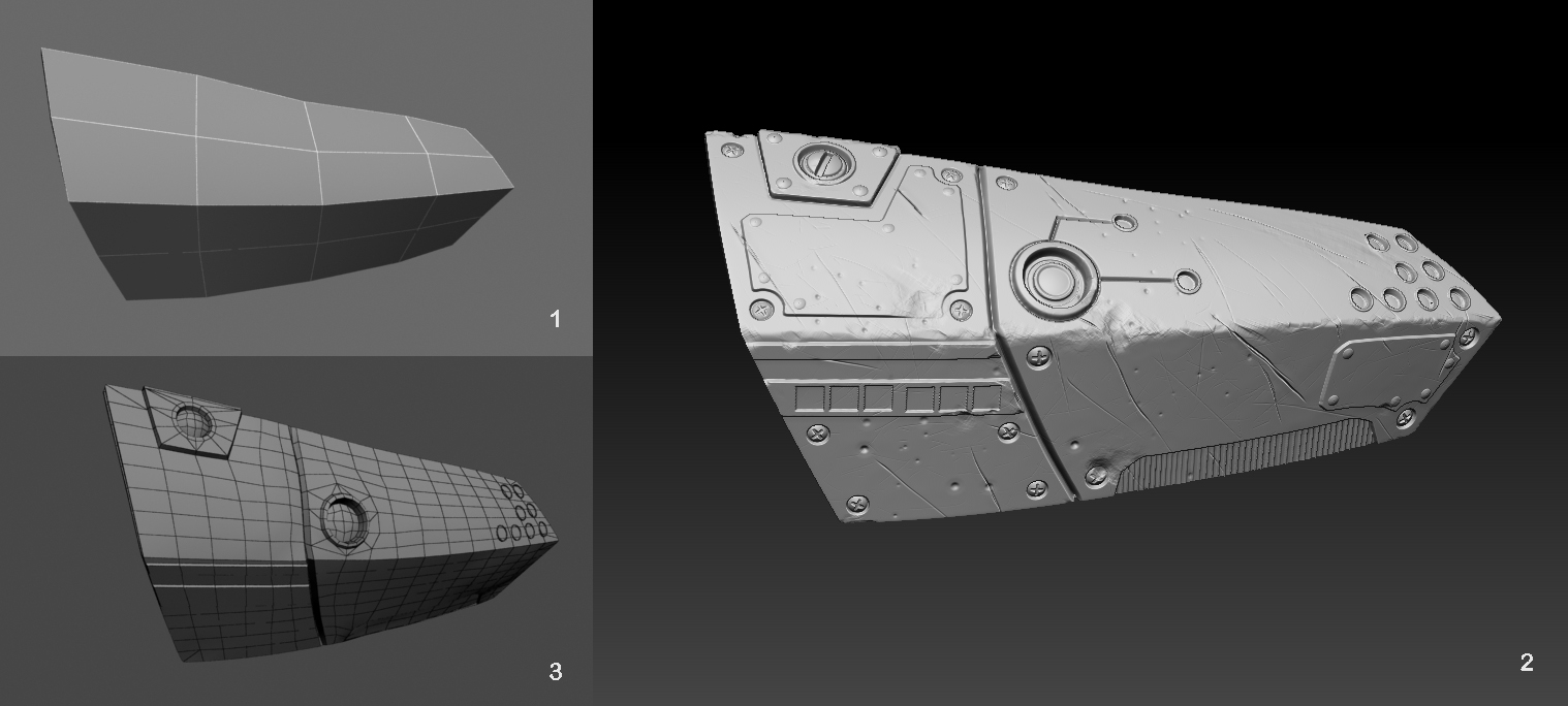 Hi, I made a simple base mesh in 3DMax then in ZBrush i made all the details and damage using a lot of new 3.5 brushes and a lot of alphas as well !! Then Retopo the mesh for the final model.