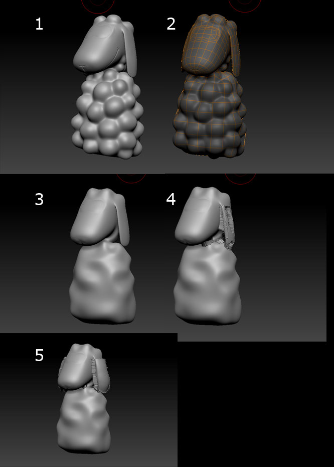 Now I am not changing anything in the topology. I simply click Preview and of course all my sculpted detail is lost (image 3). So I enable Projection and hit Preview again, make sure that Adaptive Skin divisions is set to 4 or 5. This is what I get (image 4)