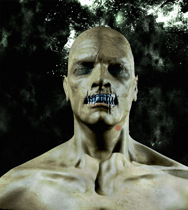The first image is a quick paintover I did in Photoshop using random images just as a skin test initially to give myself ideas for the final look of the piece but people were thinking the teeth were metallic when originally it was just that I left a basic blinn material on there while I focused on the skin.