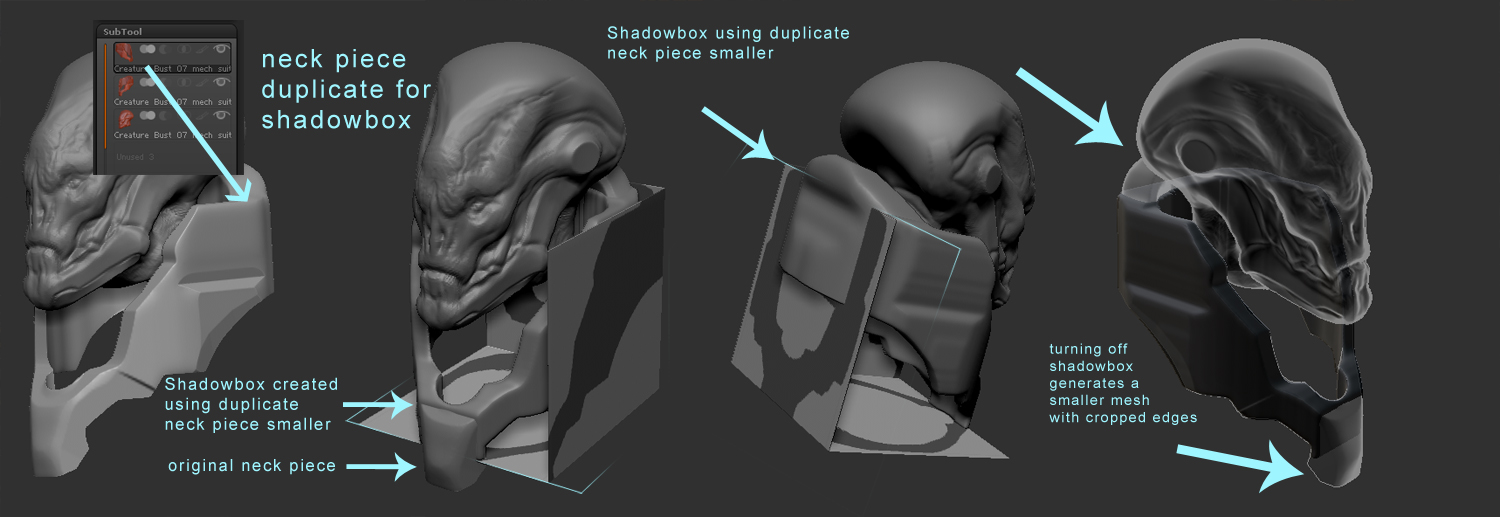 HI! I m trying to do some hard surface modeling using shadowbox. the neck piece ( see image ) was made using shadowbox. to add more parts to the neck piece and to have it as reference for size i basically duplicated it ( ctrl + shift + D ) and pressed shadowbox. This was done so that the shadowbox created takes the size of the neck piece which would help me go in and do new masking to create smaller parts. However when I press shadowbox i get a new shadowbox that is smaller than the subtool used to create it and some parts of the subtool are simply cropped out of it. is there some way i could create shadowboxes that closely match the subtool used to create them in terms of size? plz help. hope my question made sense, it is a bit difficult to explain…