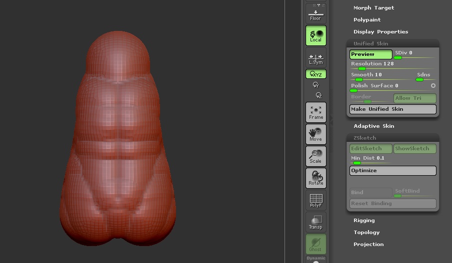 I am using sketch Z Spheres and have built up the muscle mass of a sculpture using sketch Z Spheres around an ordinary Z Sphere armature. Here’s my problem: how do I view and/or create an adaptive skin? When I am sketching with Z Spheres and I press adaptive skin (the ‘A’ key), the preview does not show any of the sketch Z Spheres, only a slightly distorted version of the base armature. I never had this problem when using plain old armature Z Spheres. What am I missing? I just want to create an adaptive skin for my model so I can start sculpting in detail.
