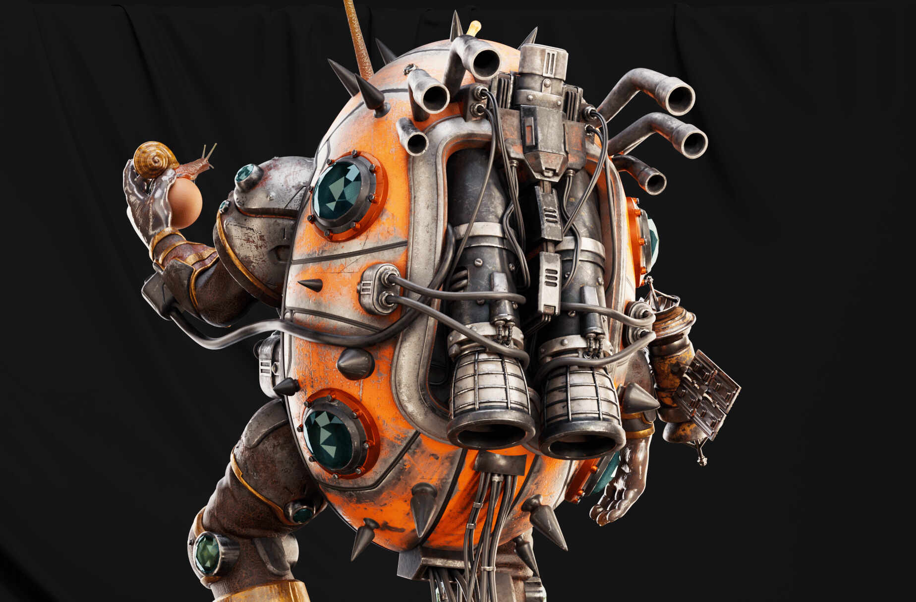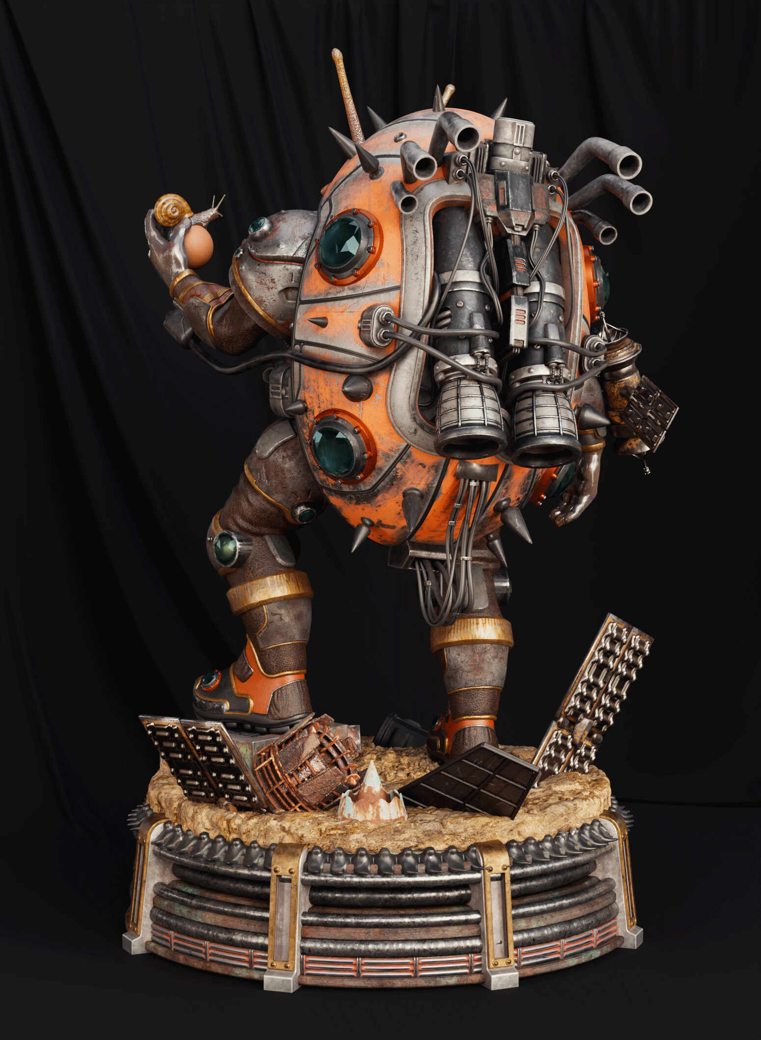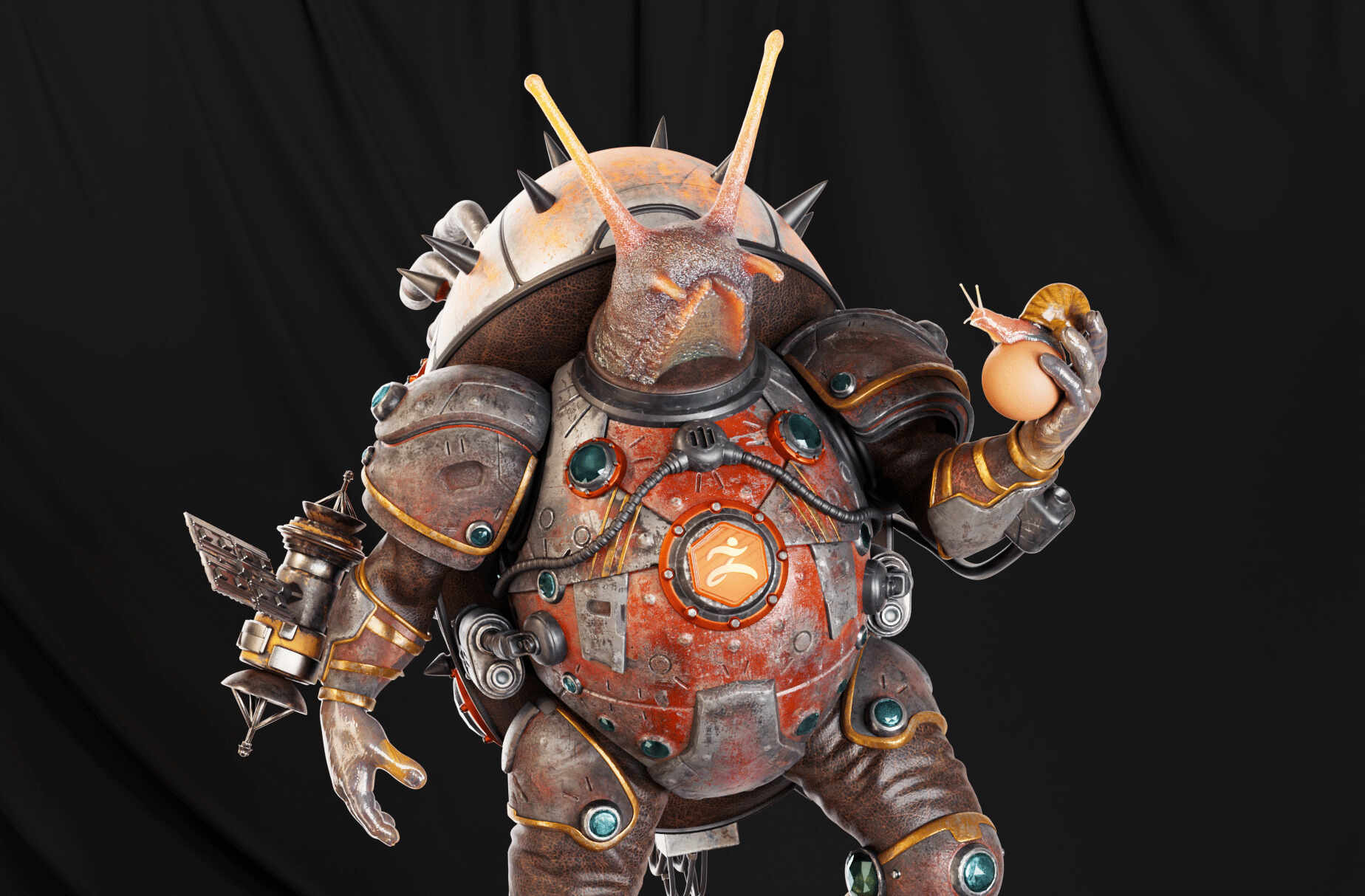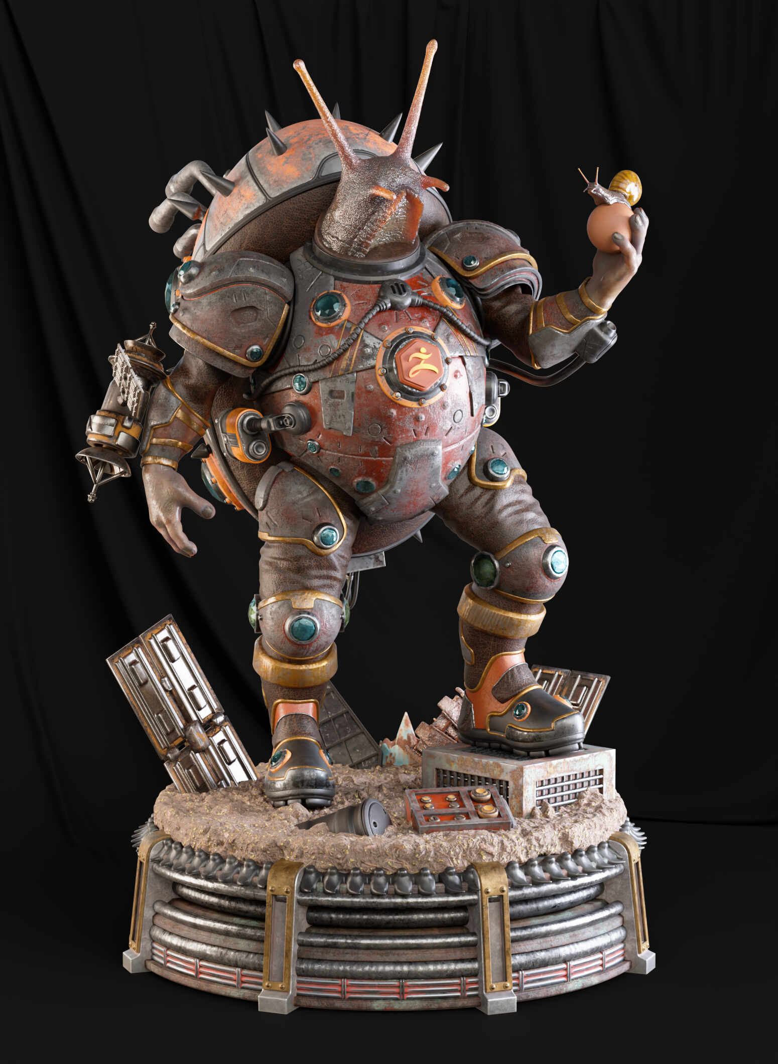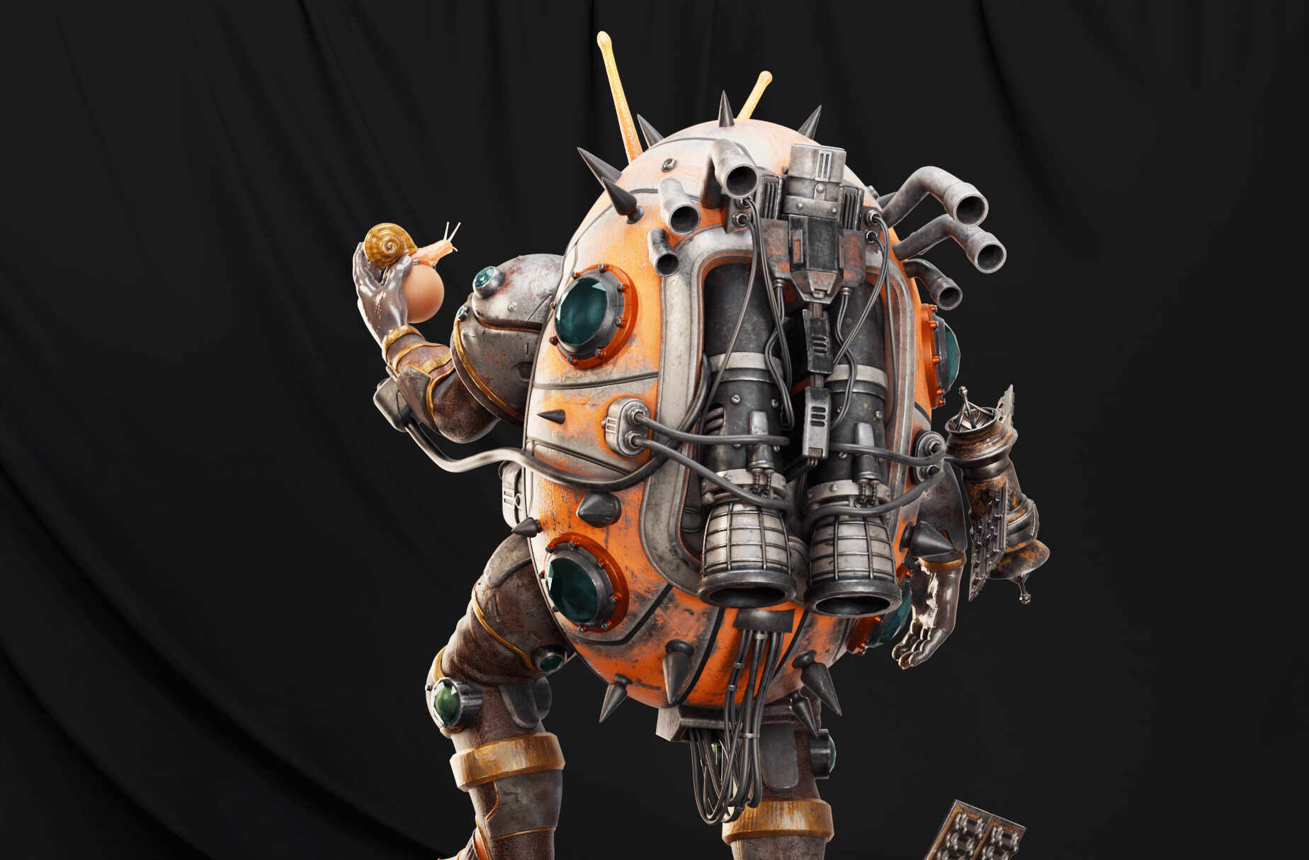I’m very happy to show you this new artwork. I was invited to be part of the ZBrush beta tester team 2026. Meet my giant rusty snail mech warrior and his tiny golden buddy, he’s proudly showing off like “look what I found!”