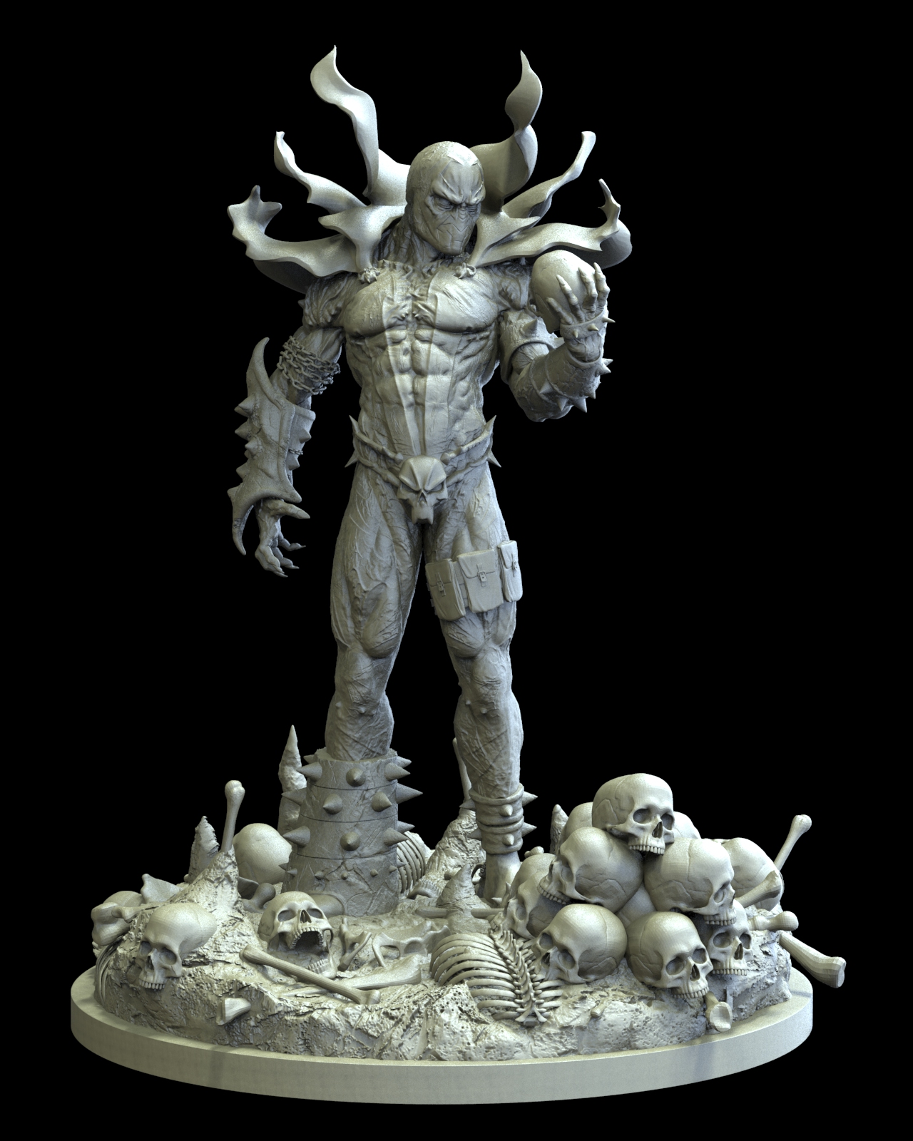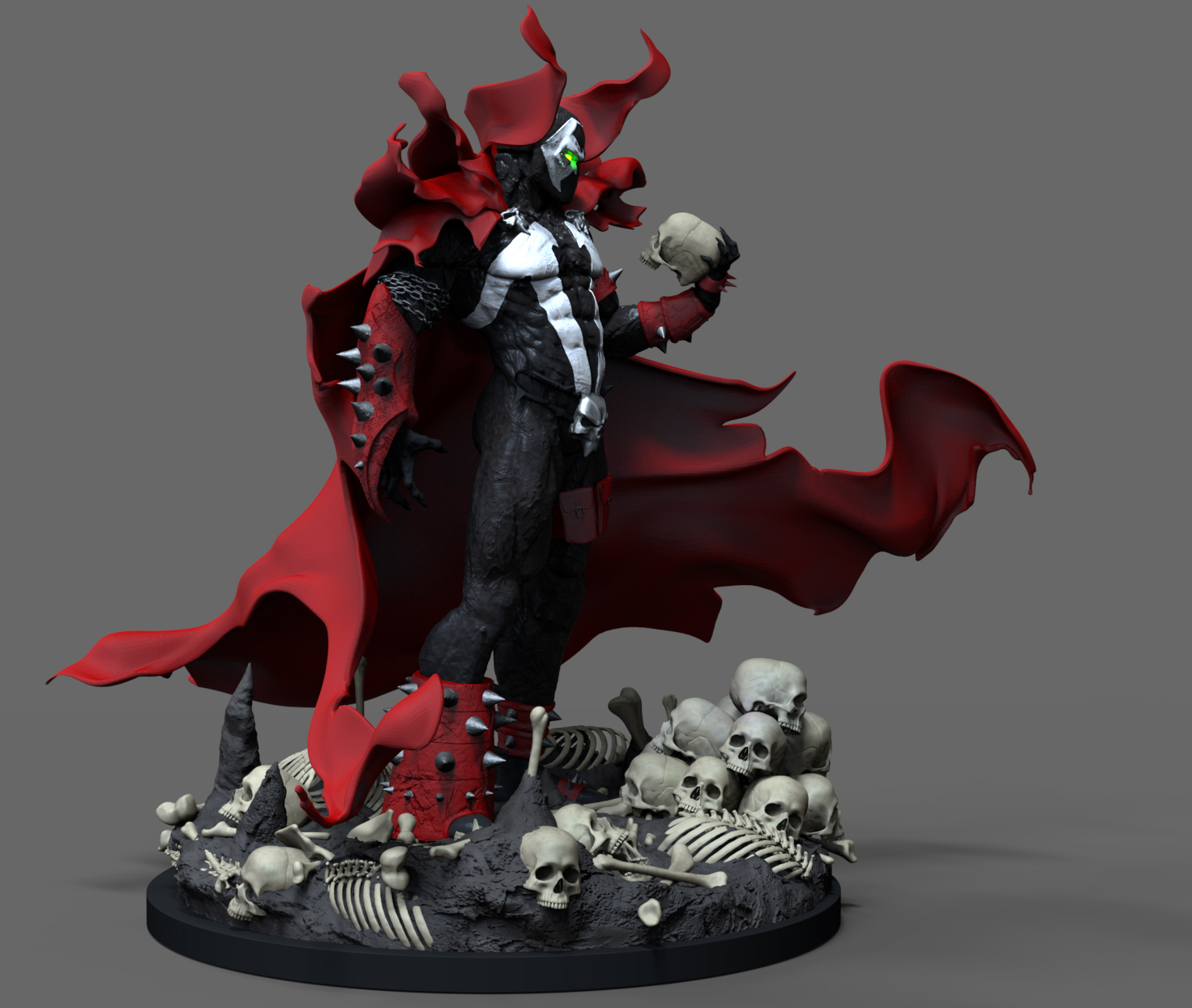 Very nice! I am a fan of Spawn and the cool look he brings. I think you are definitely on the right track. A small crit but try changing up the skulls a bit just so the dont look like a copy/paste skull. You can even do some of this fix in photoshop with the liquify tool for some areas.