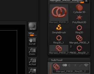 I am a new user to zbrush and I am trying to learn all the ropes. currently i am designing a ring. i have managed to sculpt it and save it as a ztool. what i need is that ring which i have created duplicated and the two joined by a single rod. My original idea was basically i would copy and paste and use the preset ztools to make the rod. I have since learned that cant work because i can then not go back into edit mode once i have left. from my research i believe i will need to use polygroups or subtools but for the life of my i cant figure out how. in my subtool palette i have two rings but i can not see both at the same time to work with them appropriately, in fact i dont even know if i am looking at two objects rings because they are meant to be identical.