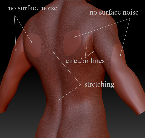 Im having trouble with applying surface noise. I cranked down towards the color black so you guys could see it… the model is clear from any masks. Im just wondering why my surface noise is only limited to a certain area of the model and it got some weird lines, patches of no noise at all, even the arms and legs have no noise applied… There are stretching happening in certain areas… how can this be fixed? THANKS