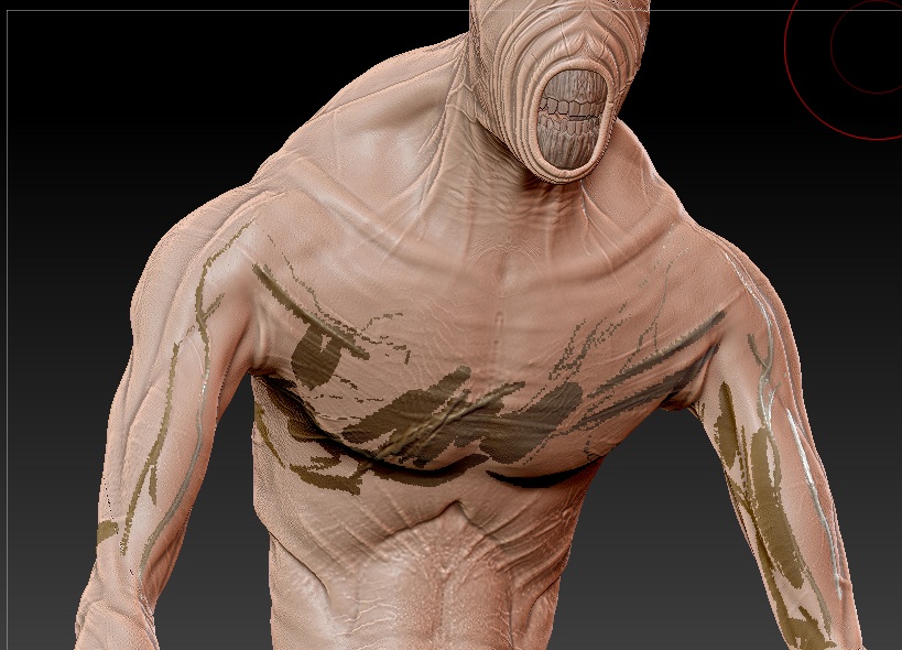 - Once I’d finished putting basic textures around in the manner mentioned above I then chose a simple brush to draw some details on such as veins and little scars etc.