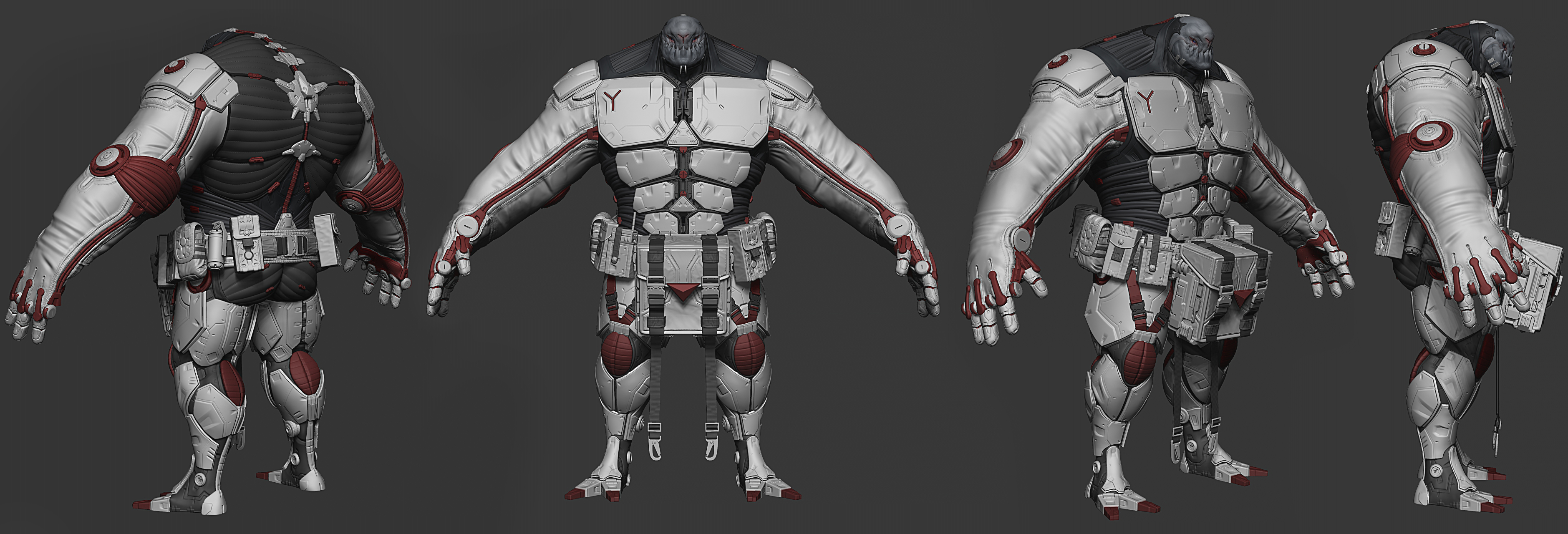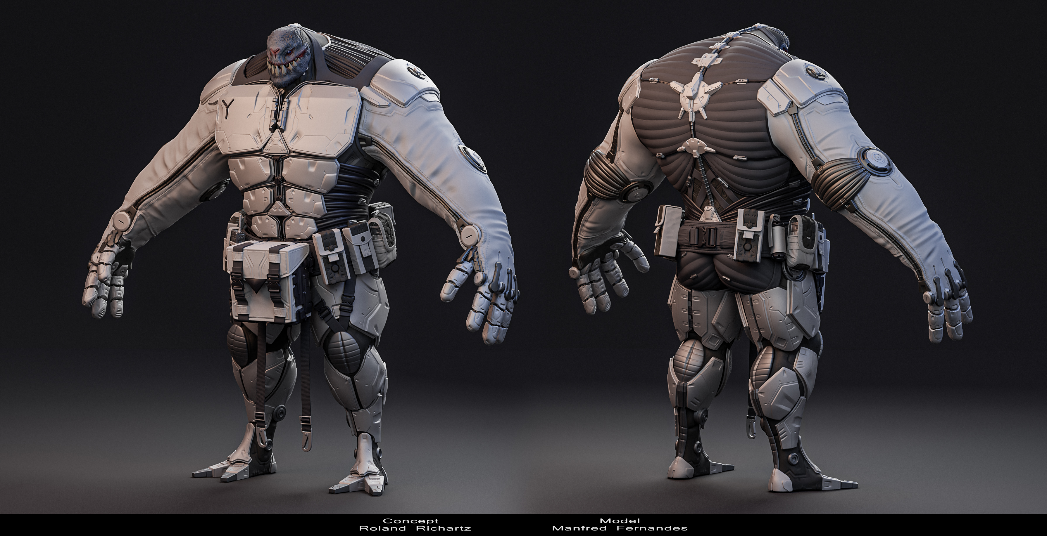 I was incredibly exited to participate in the latest Artstation Challenge. I saw some fantastic concepts and have always wanted to participate in the past. I started working on bringing to life the amazing concept by Roland Richartz, and he was kind enough to keep in touch with me and provide me with further design work that he had done for the character. Unfortunately, life happened and I was not able to dedicate the time needed to complete the contest. I do intend to finish it up in my own time but wanted to share the work that I have done so far. Everything was modeled inside of ZBrush. Also since I recently started learning Blender I decided to throw the big guy in there and play around with materials and lighting. That program is so dope! Finally did some post work in Photoshop and he was ready to go. Once I finish up his weapon I will give it the same kind of treatment, post it up and move on to working on the low res and actual textures. Thanks for stopping by and if you have the time go on over and check out Roland’s other awesome works! Cheers!