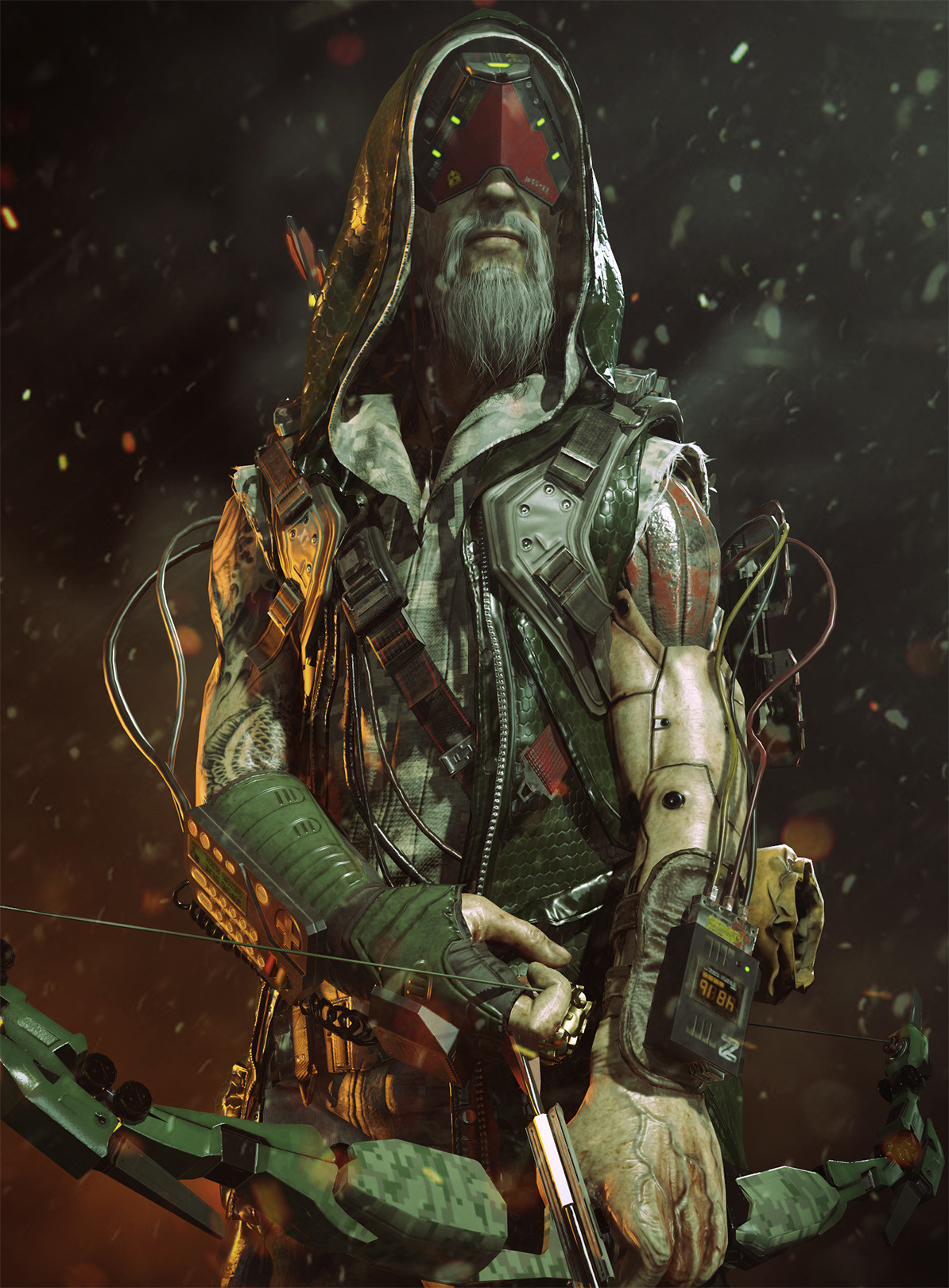 The Elder’s true age is un-known. What is known is that he is one of the few people left on Earth who has managed to live off of the grid. All of his electronics are analog, which allows him to avoid detection. His artificial physical enhancements are all illegal black market grade. also untraceable. He roams the poisonous ruins of the old world, scavenging what he can use to prolong his life. To what ends, we are unsure.