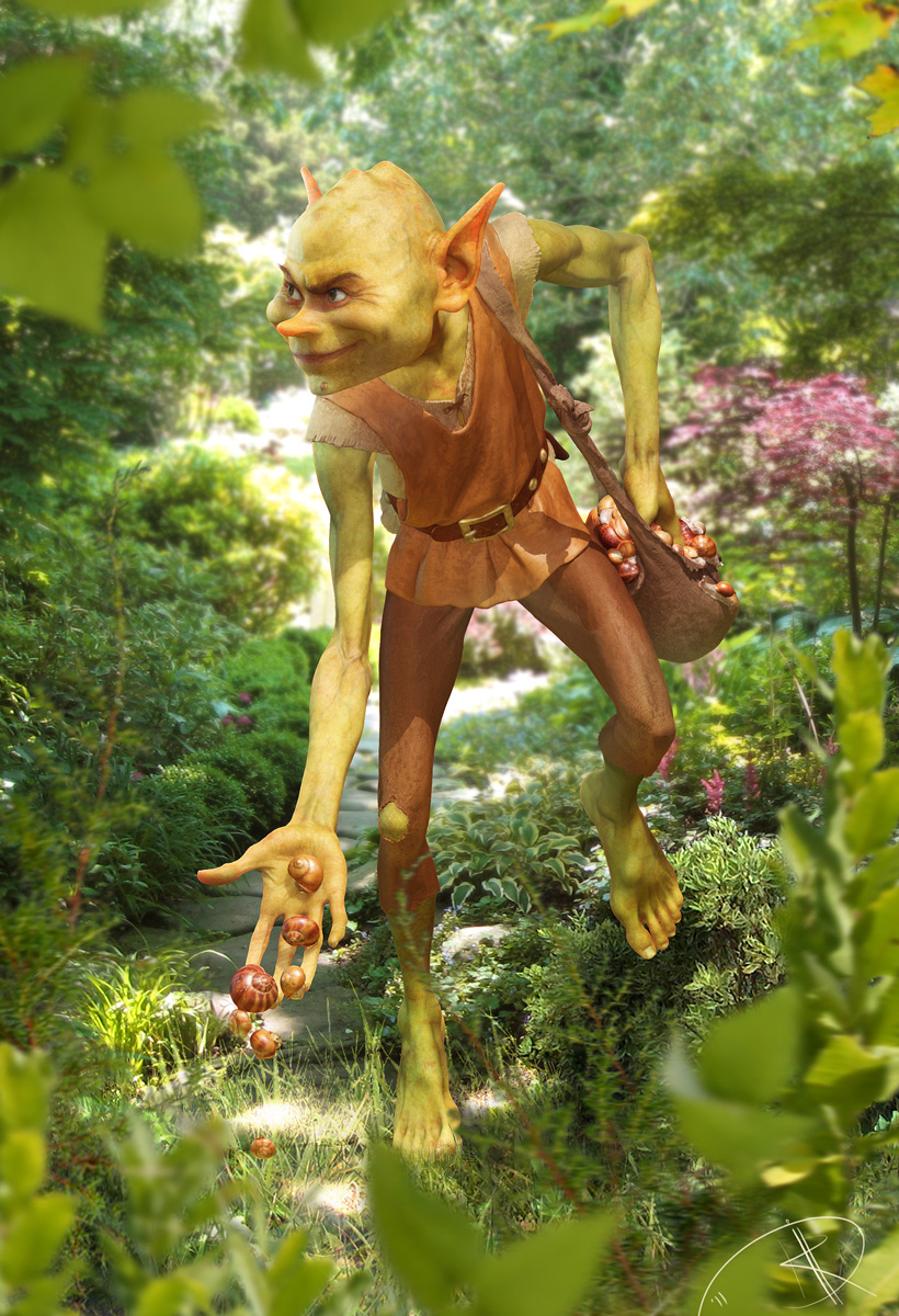 First, I think the model looks soft, has lost a lot of detail. I suck at rendering so I cant give any constructive criticism, juts this observation. Second, I would imagine the snail guy in a misty and wet morning landscape or after a rain. Snails show up after the rain or in wet and dark places so I think the scene is too bright and dry for them. I hope you dont mind my suggestions, I juts want to see this guy in a great image (and I can`t do it).