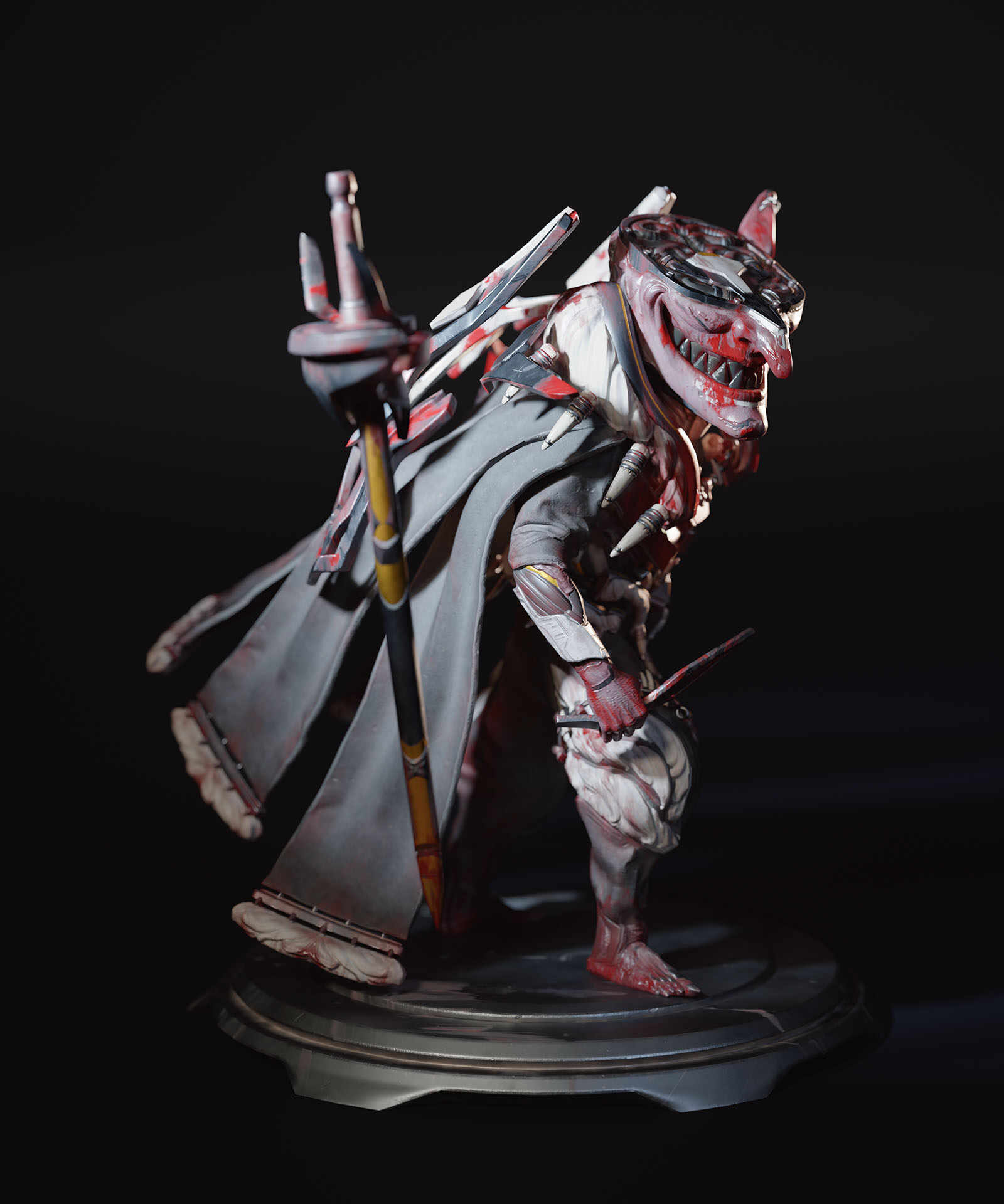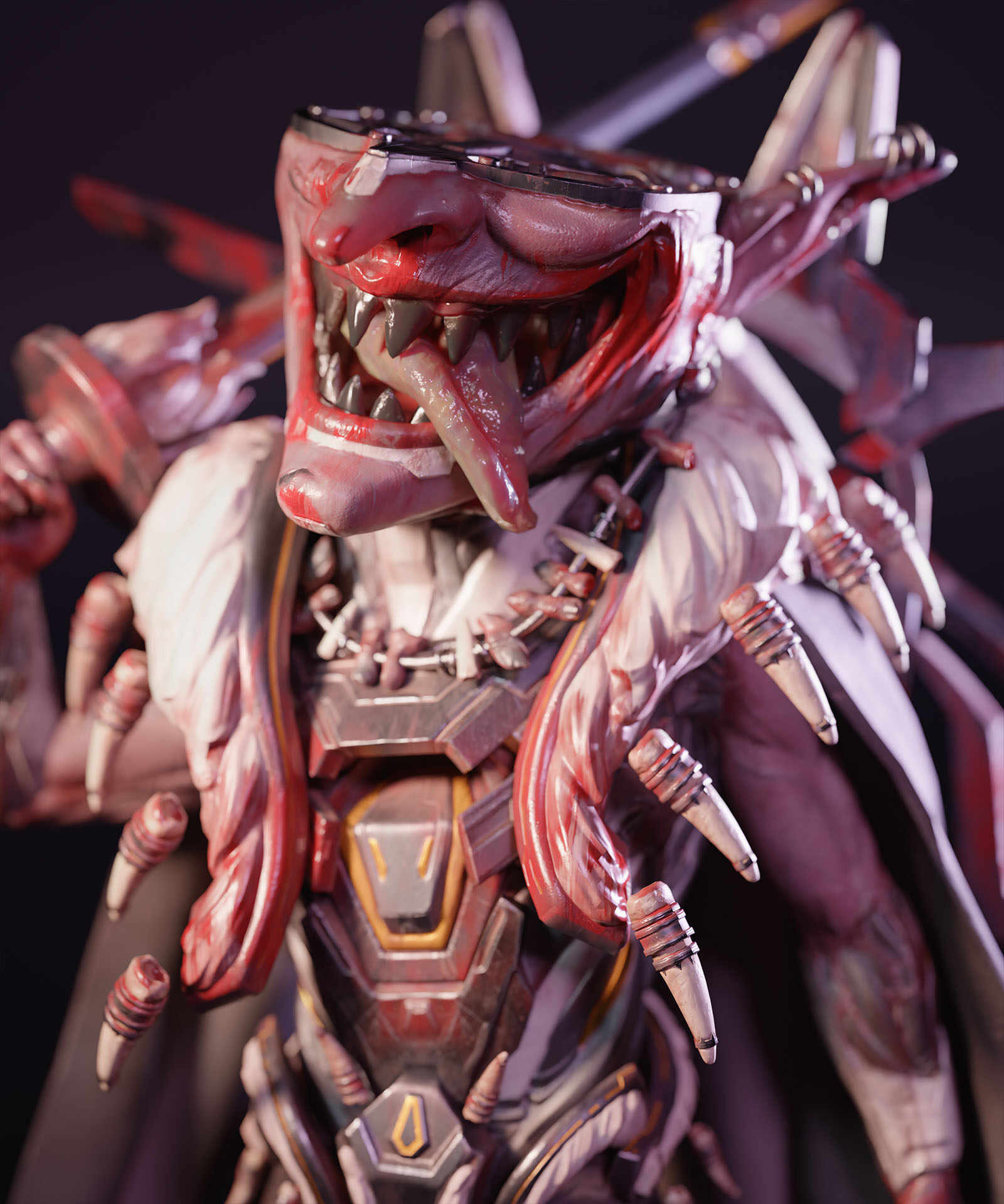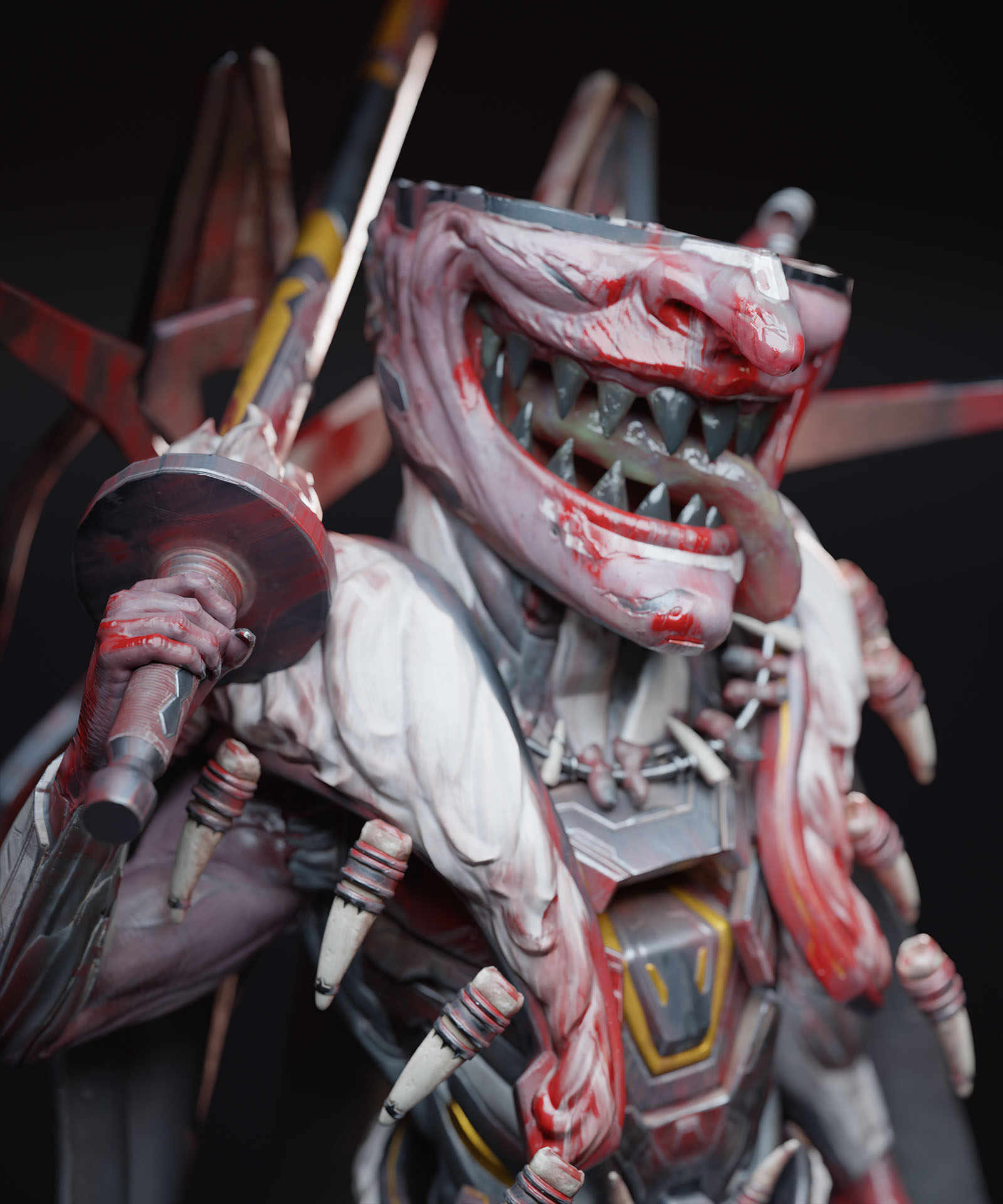 For the texturing i made sure to add plenty of breakup and i also tried for some decent storytelling like the scratches, scrapes and of course BLOOD! Theres quite a bit but i made sure to include them in areas that seemed to make sense like the hands, mouth and chest areas… I also tried for quite a bit a breakup with the materials like he skin, metal, rubber and fur…