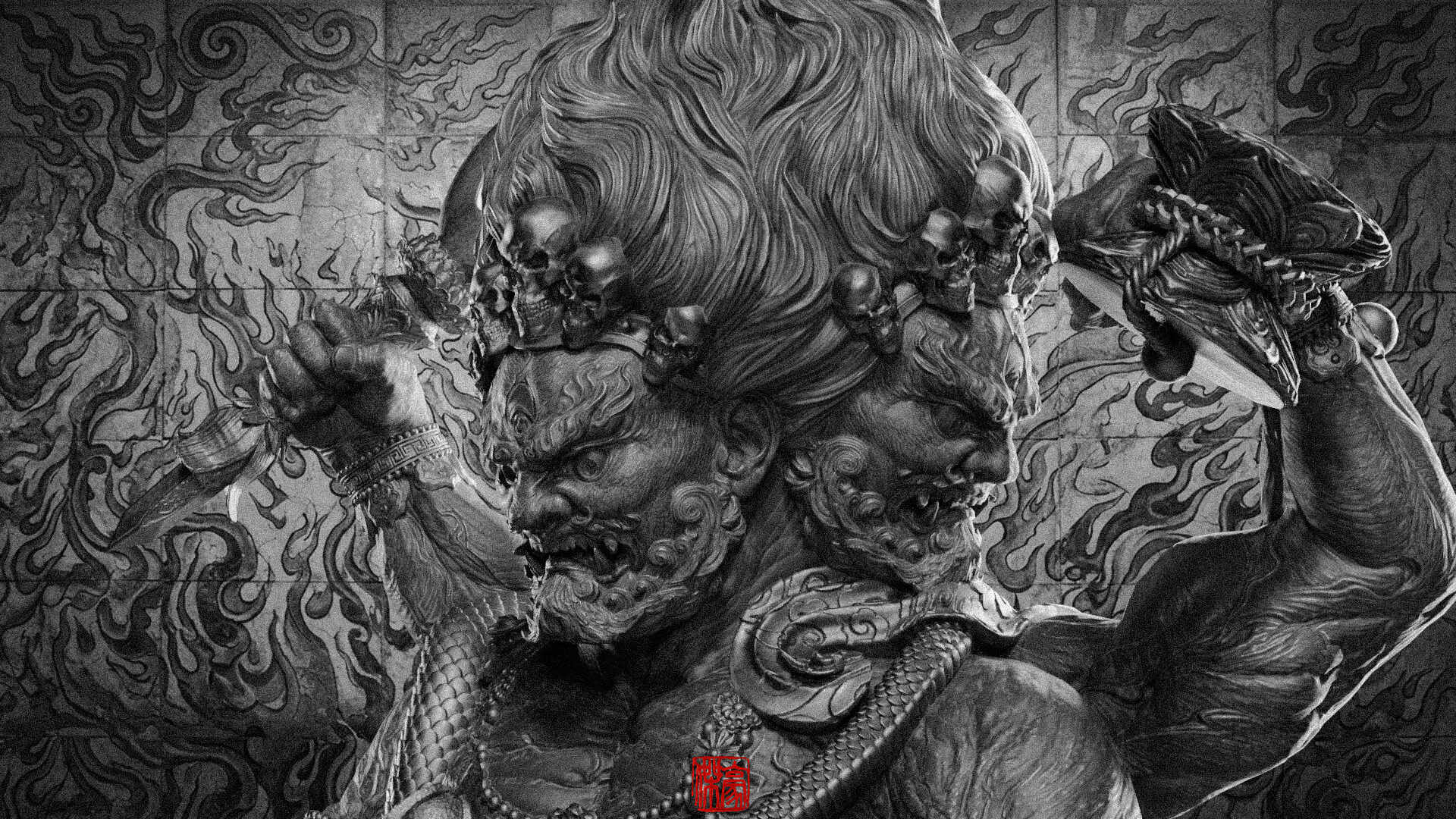 这是我去年制作雕刻的大黑天,我负责全部角色雕刻,部分道具不是我做的。现在马上要生产实物了