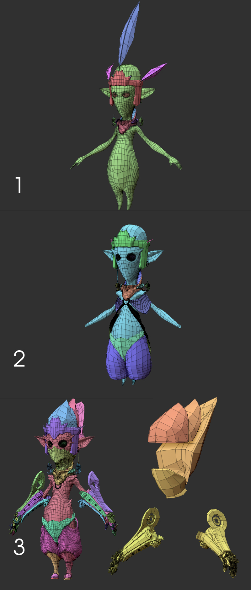 I Have try to find 3 pictures from each character. In the great ligne of the creation, for basic modeling. But, there is still some retopo on some mesh.