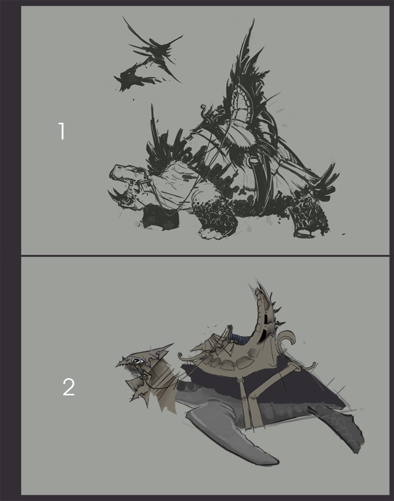 I absolutely love the design work here, from the gnome to the turtle to the armor. A very interesting and unique style, just fantastic, can’t wait to see it completed!