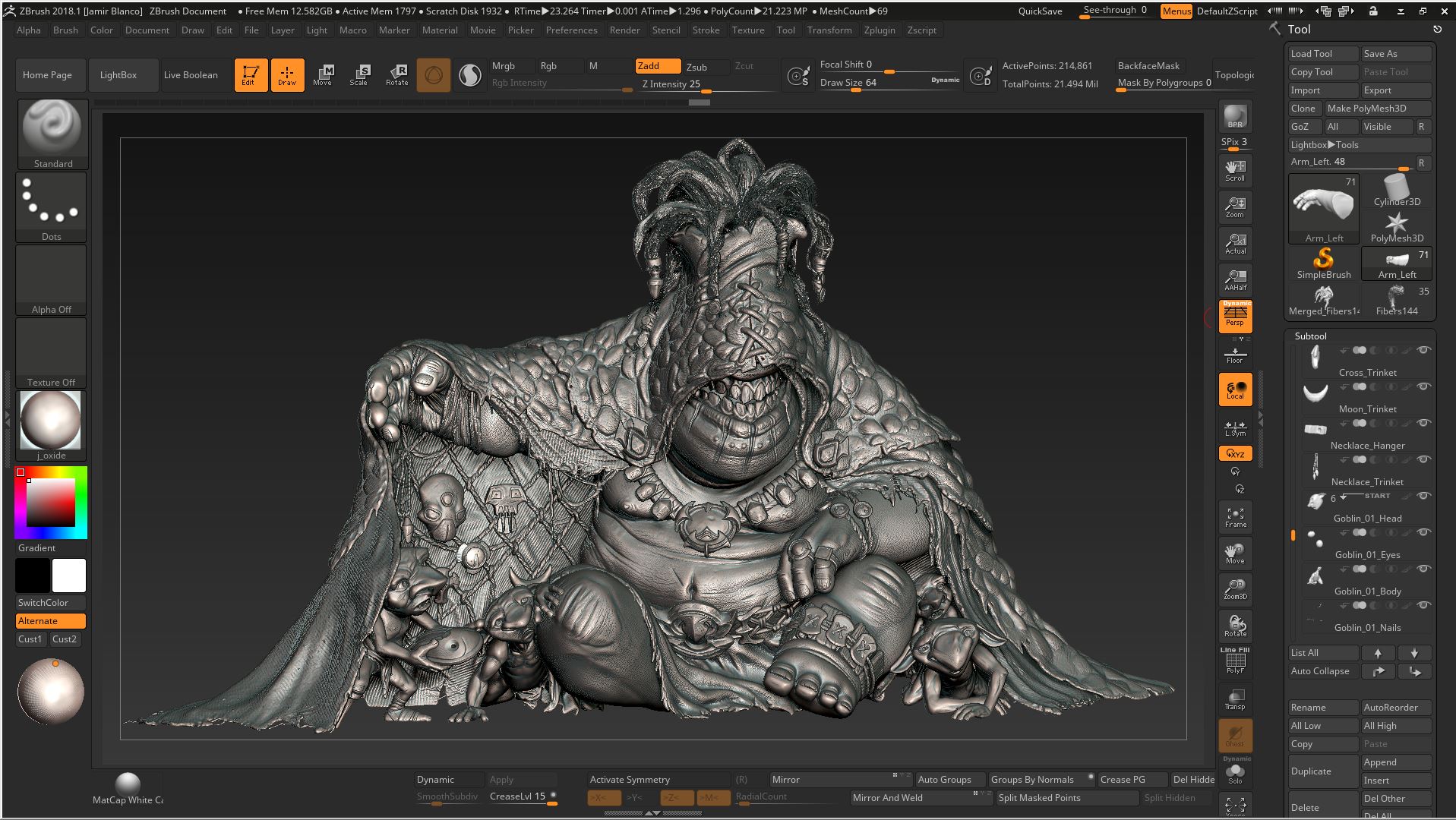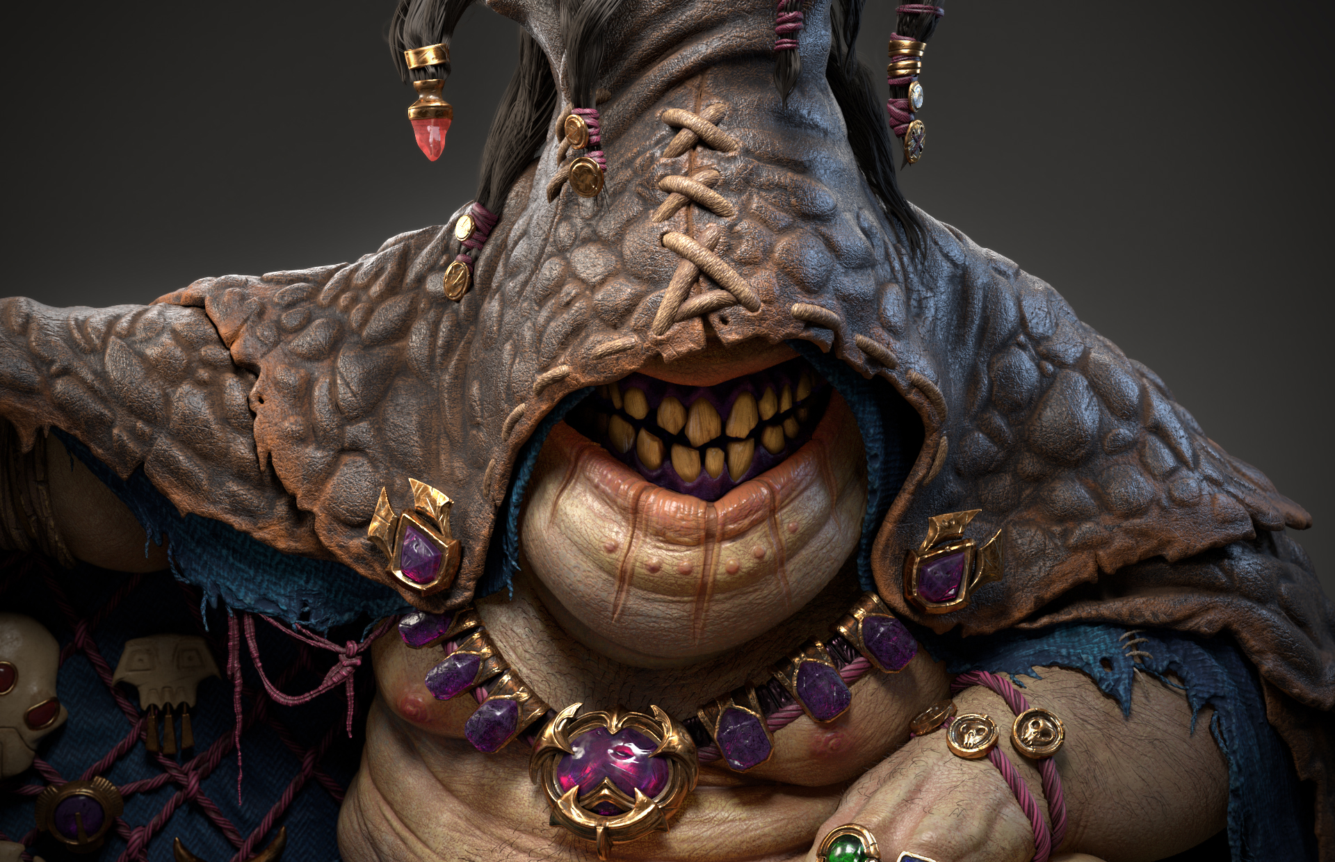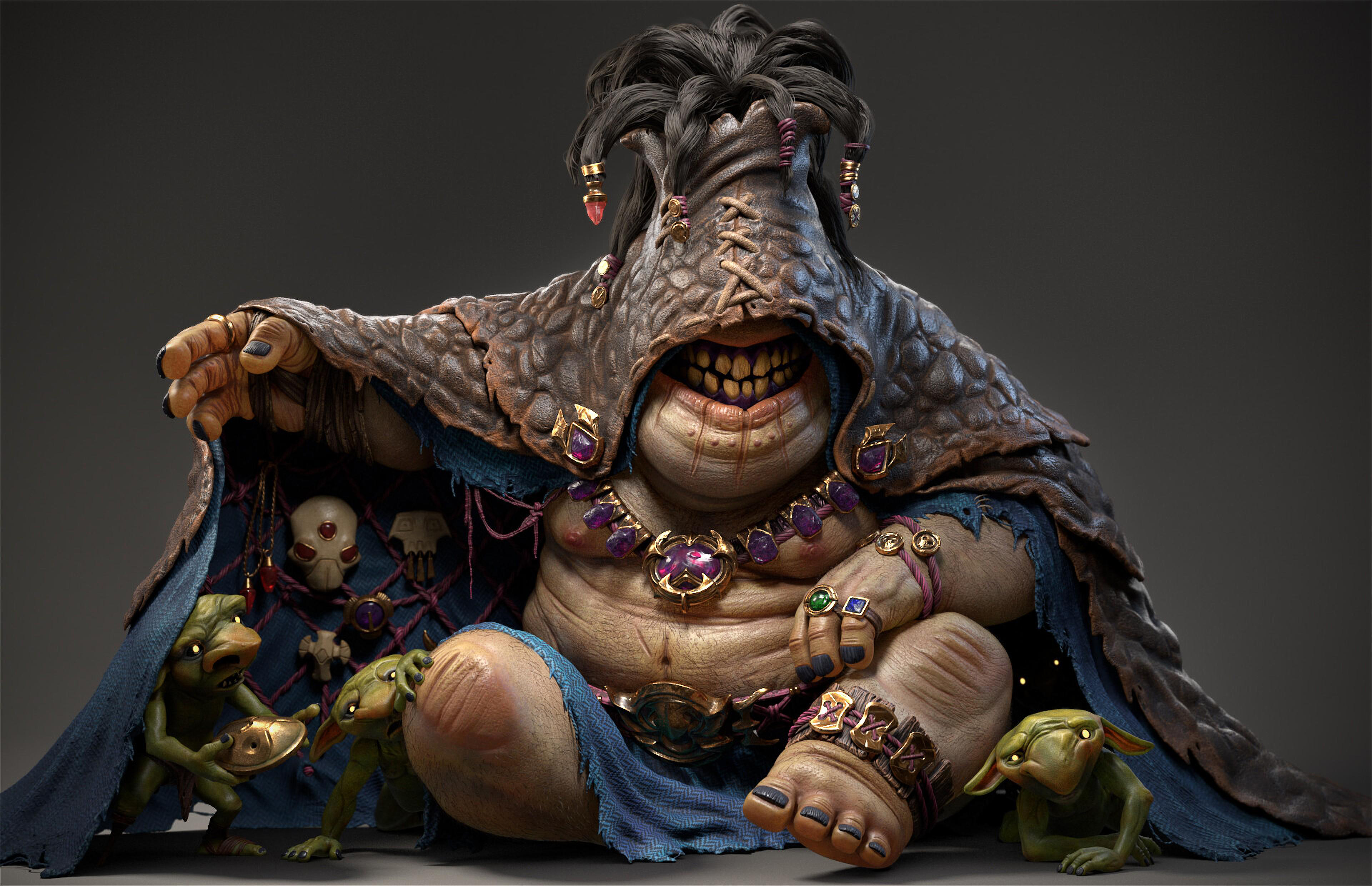 Personal project I did last year for fun! No Base meshes used, everything sculpted from scratch without symmetry for more practice. For the Trinket Dealer I started with ZSphere sketch, blocking out main masses and final intended pose, then Dynamesh workflow from there. Minions were sculpted separately in pose as well then brought into the scene for placement and final touches. Zremesher was used to get better topology and easier UVing. Textures done in Substance Painter, final renders in VRay. Concept credits go to the amazing Tooth Wu. Thanks for viewing!