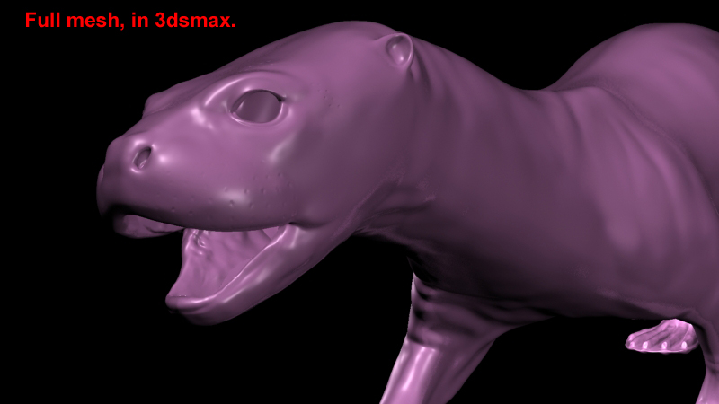 The map is inserted into a “bump map” shader in 3dsmax. Smoothing is on, Multiplier is set to 0.3. Bump value is at default 30. Increase the smoothenss of the mesh model using Turbosmooth just in help out with smoothing the contours. Rendering in MR