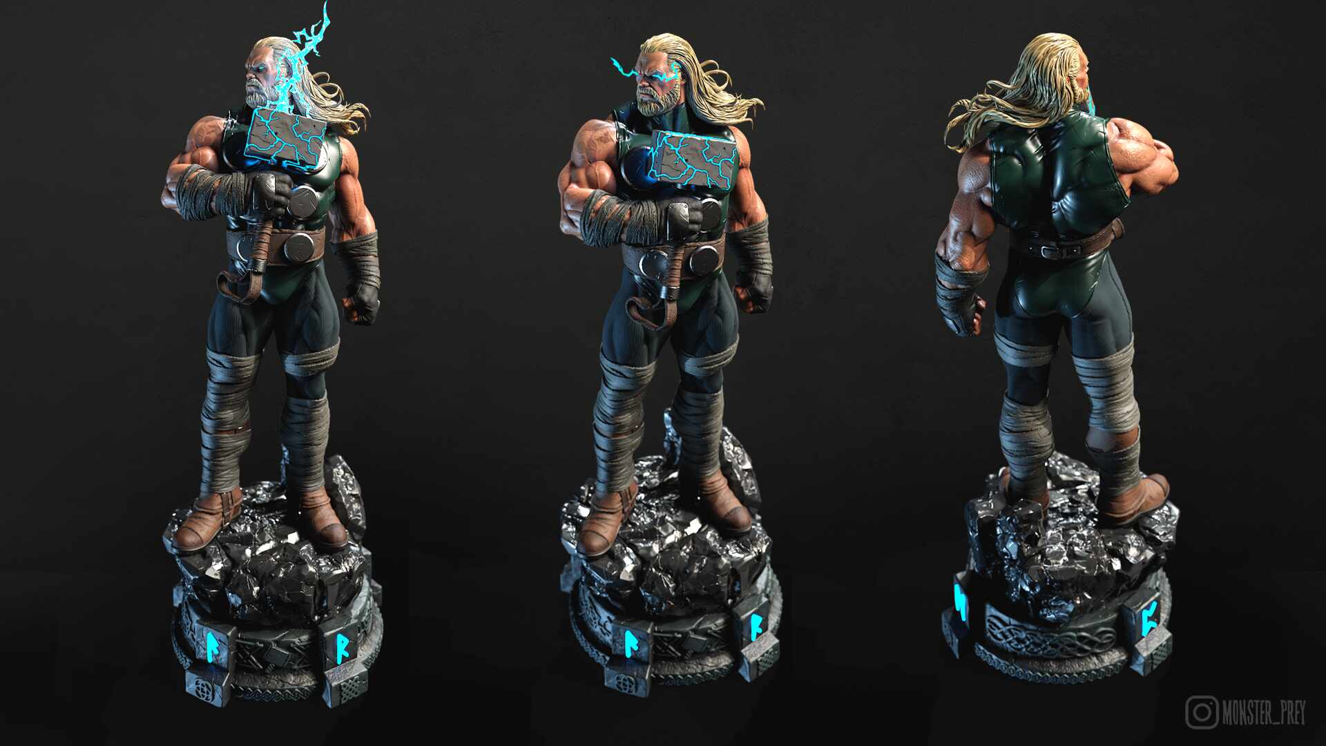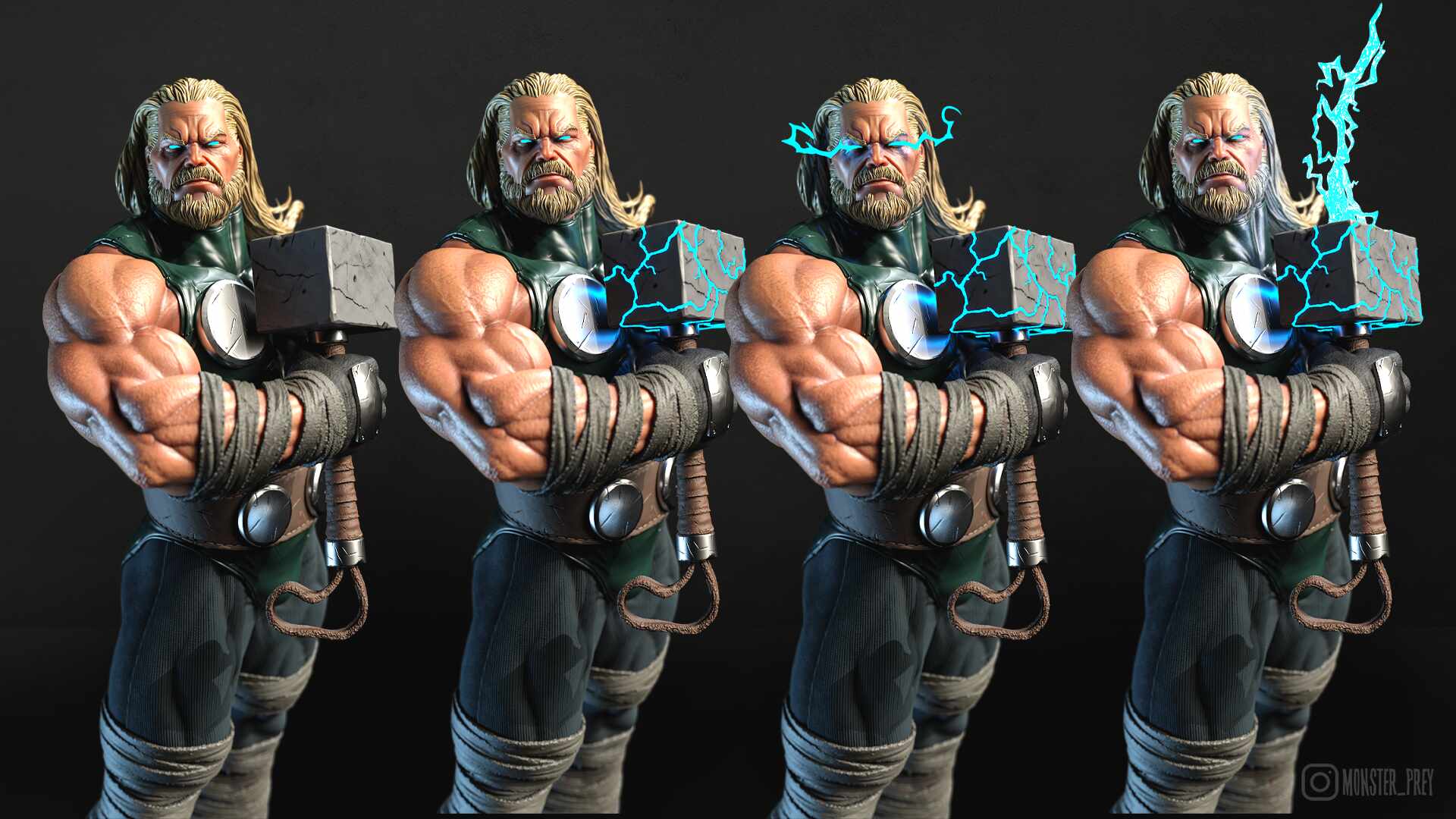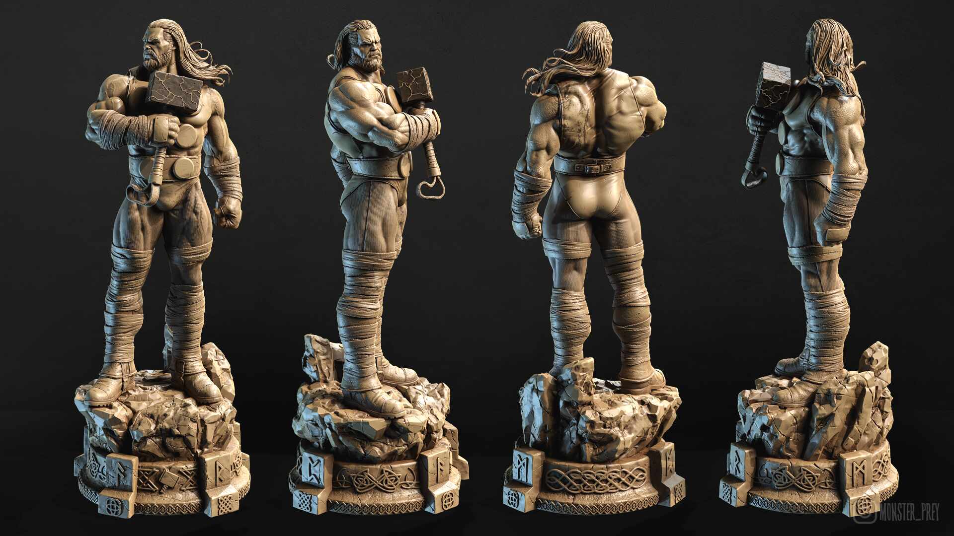 The set includes the Thor model itself. The base has detached runes. I think the runes could be made separately from a different material or illuminated. Three hammers are visible: the first is just a hammer, the second has small lightning bolts, and the third has small lightning bolts and a large one pointing upwards. The interchangeable head has lightning bolts for the eyes. These lightning bolts can also be printed separately. You can paint them with some glow-in-the-dark paint.