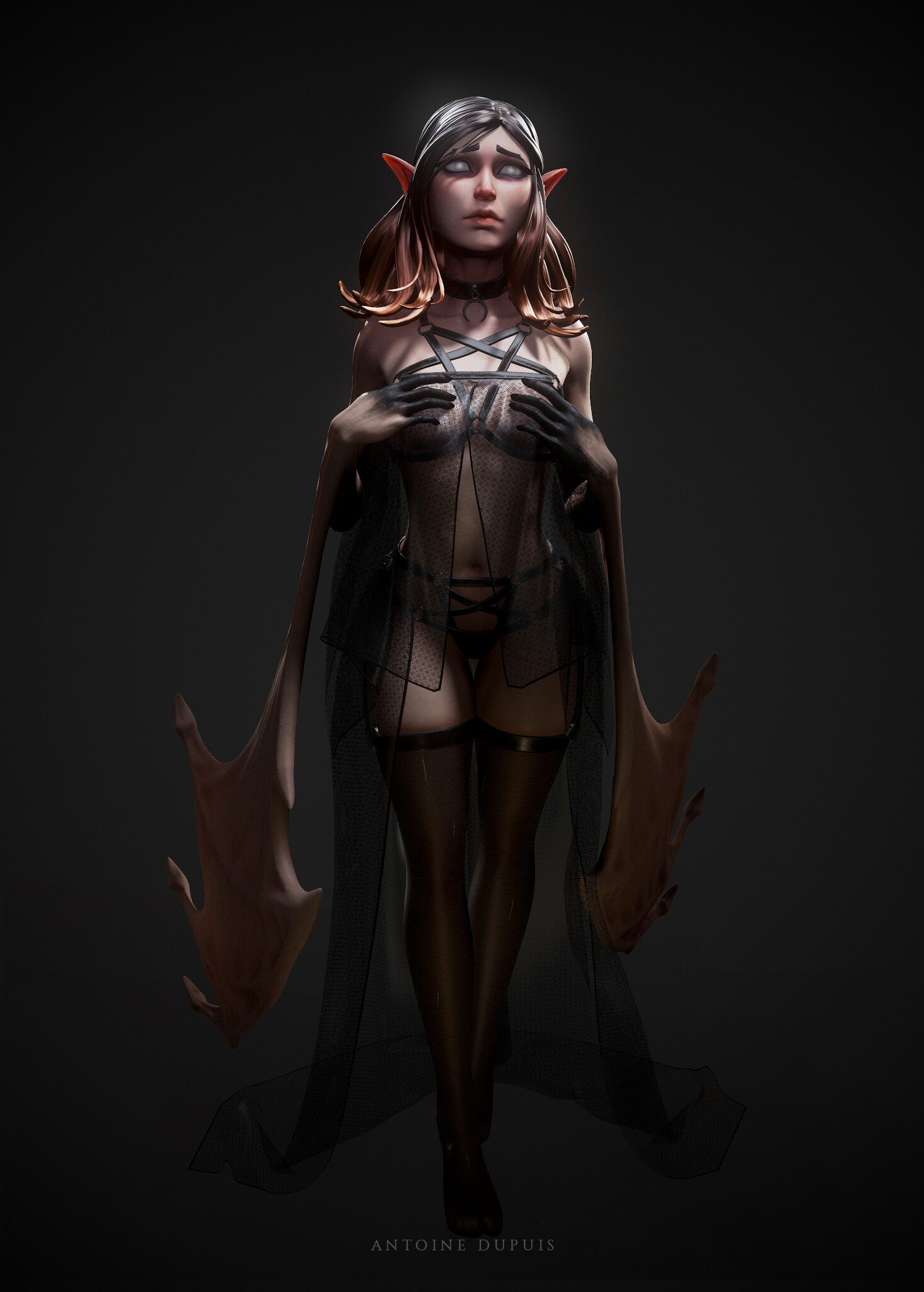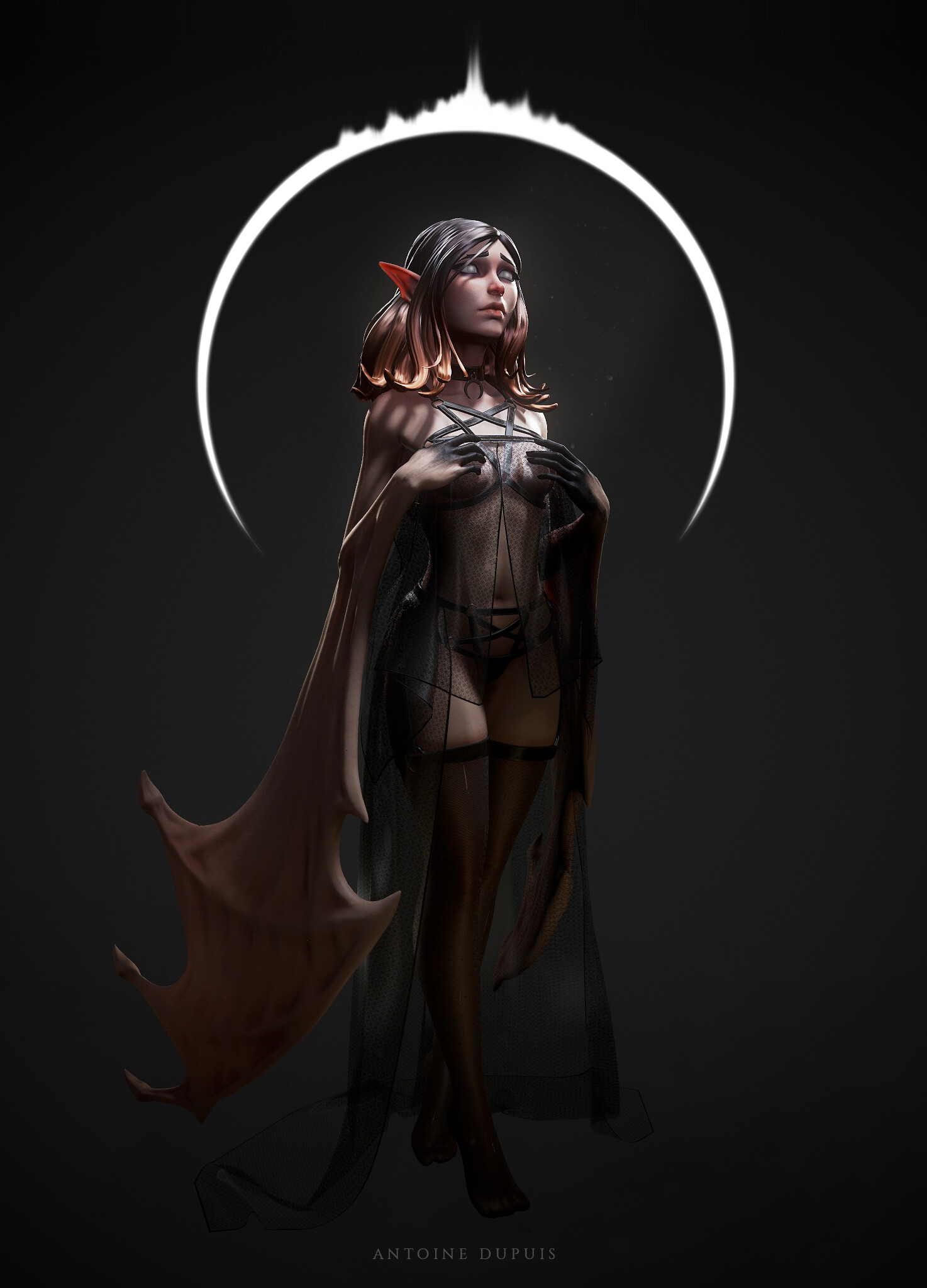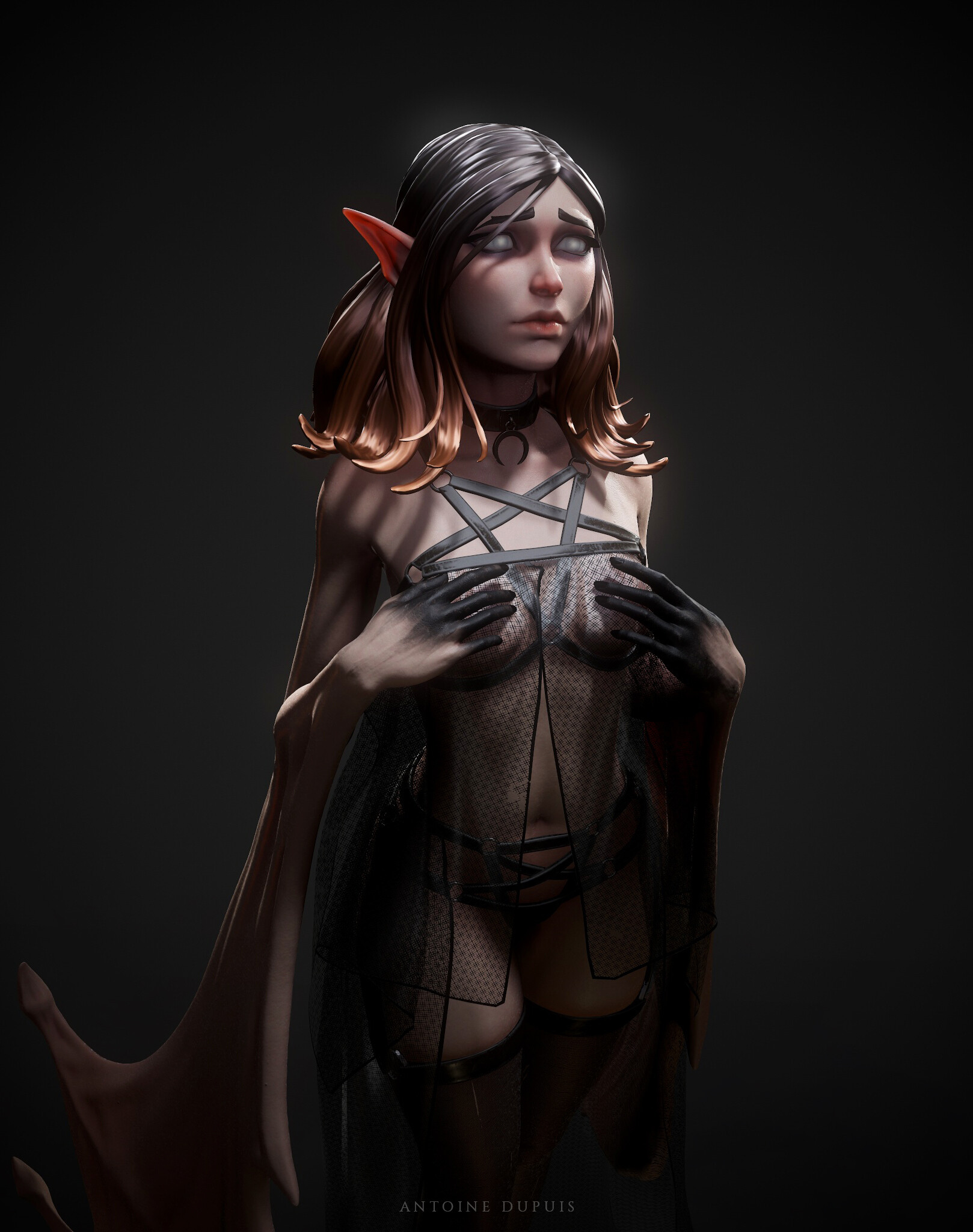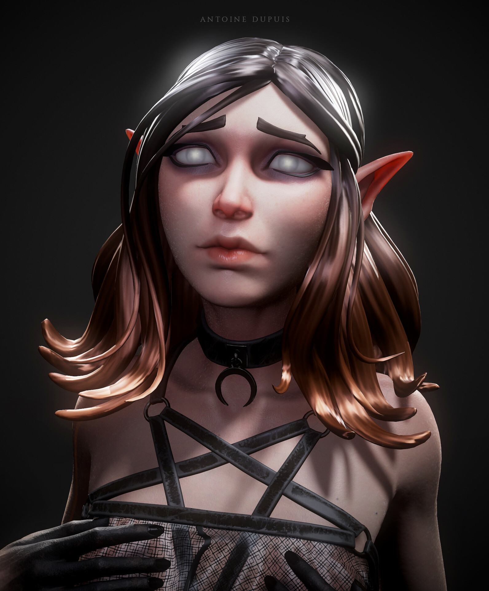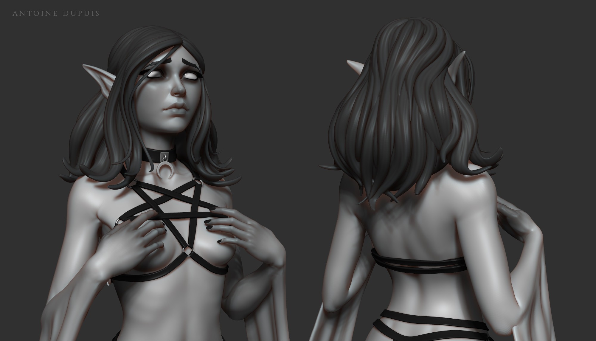The character is almost entirely sculpted on ZBrush (cloth is Marvelous Designer), and unwrapped, textured and rendered on Maya, Painter and Toolbag.