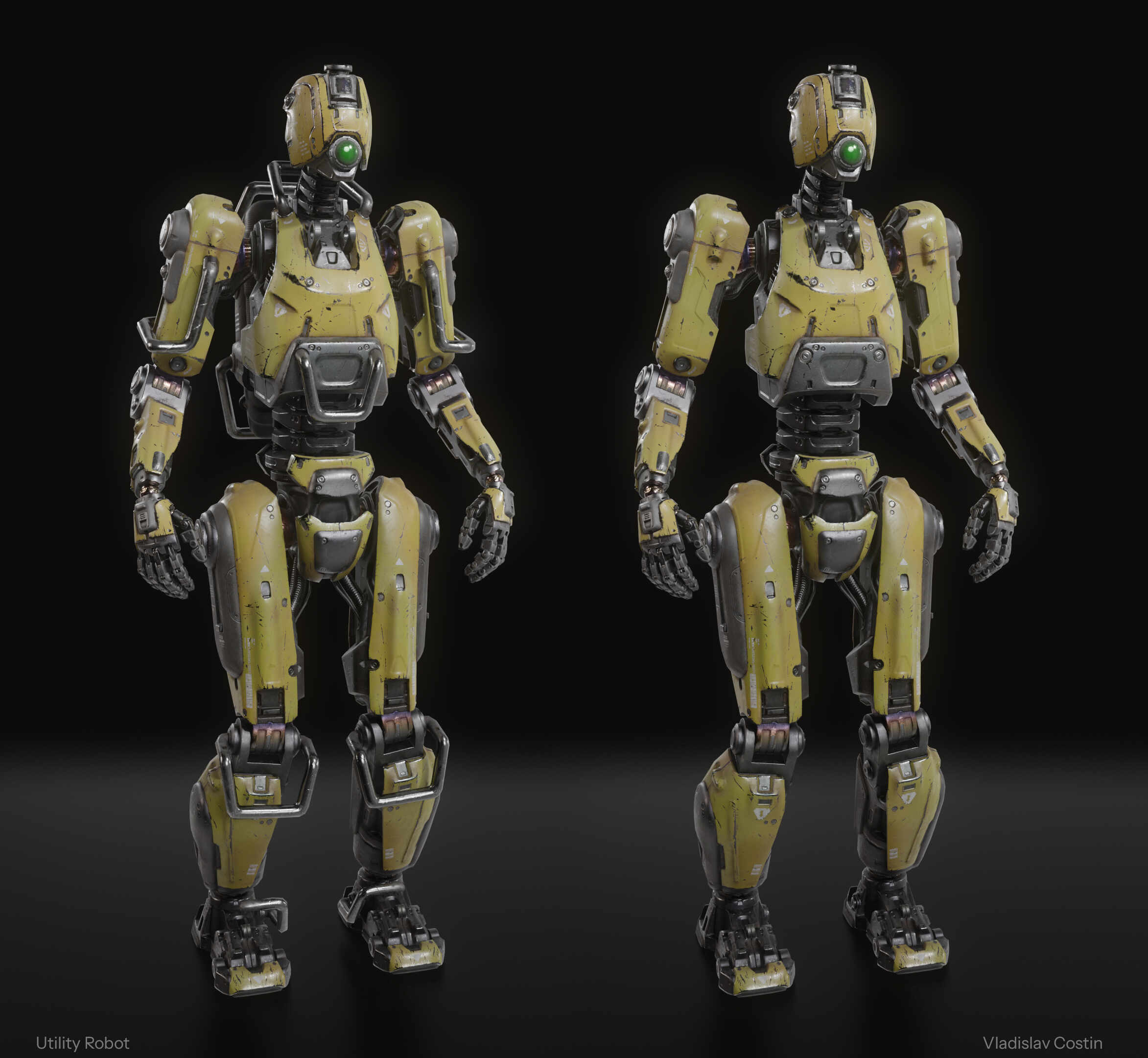 Initially, wanted to test some HARD SURFACE zbrush pipelines. Also, wanted to try some AI to generate a concept for utility robot, but that was a fiasco. Then, wanted to find somebody’s concept, but couldn’t find anything that would make me happy. Eventually, I had to go trough a painful path of designing it by myself, taking into account that its meant to be used with UE4 skeleton and standard animations, with all its constraints, that really affected the overall look, and particularly joints.