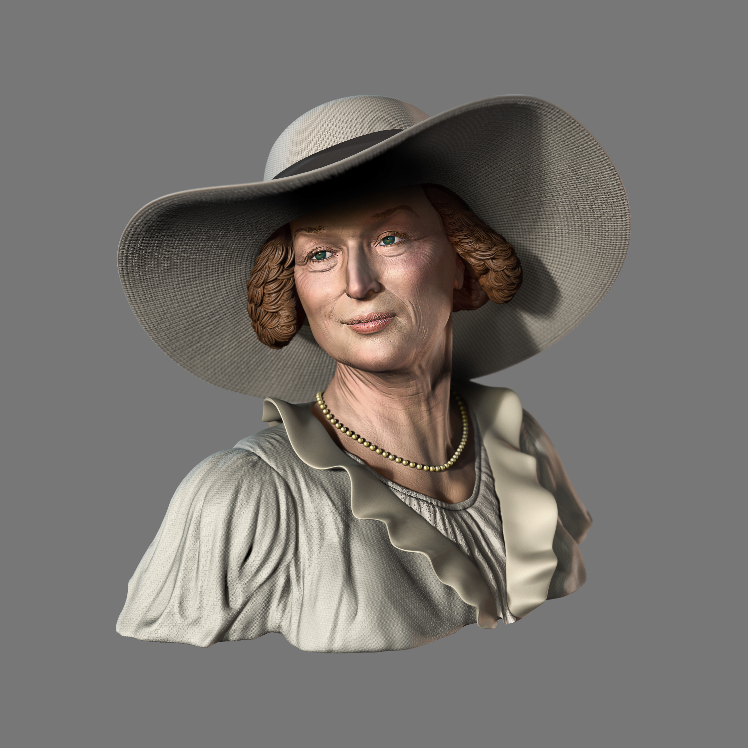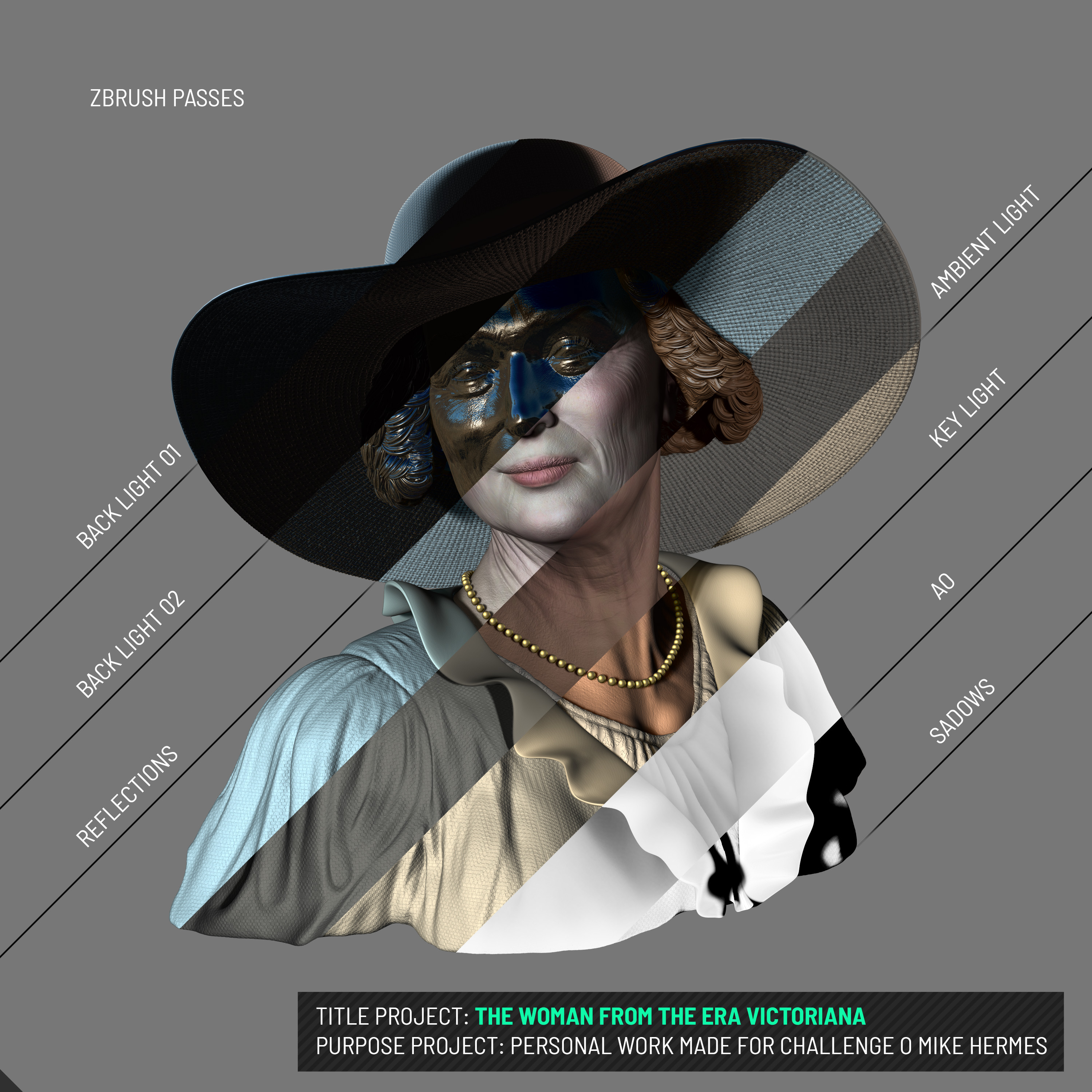Hi everyone! I share with you my personal project, made to participate in the challenger of Mike Hermes, for which, we had to design a character that fit the Victorian era style. For this bust I have chosen to make the face of someone famous as Meryl Streep as a reference and some ideas of clothes of a wealthy woman of the time. All the project is developed in ZBrush as well as the render that has been composed in Pothoshop. Hope you like!!