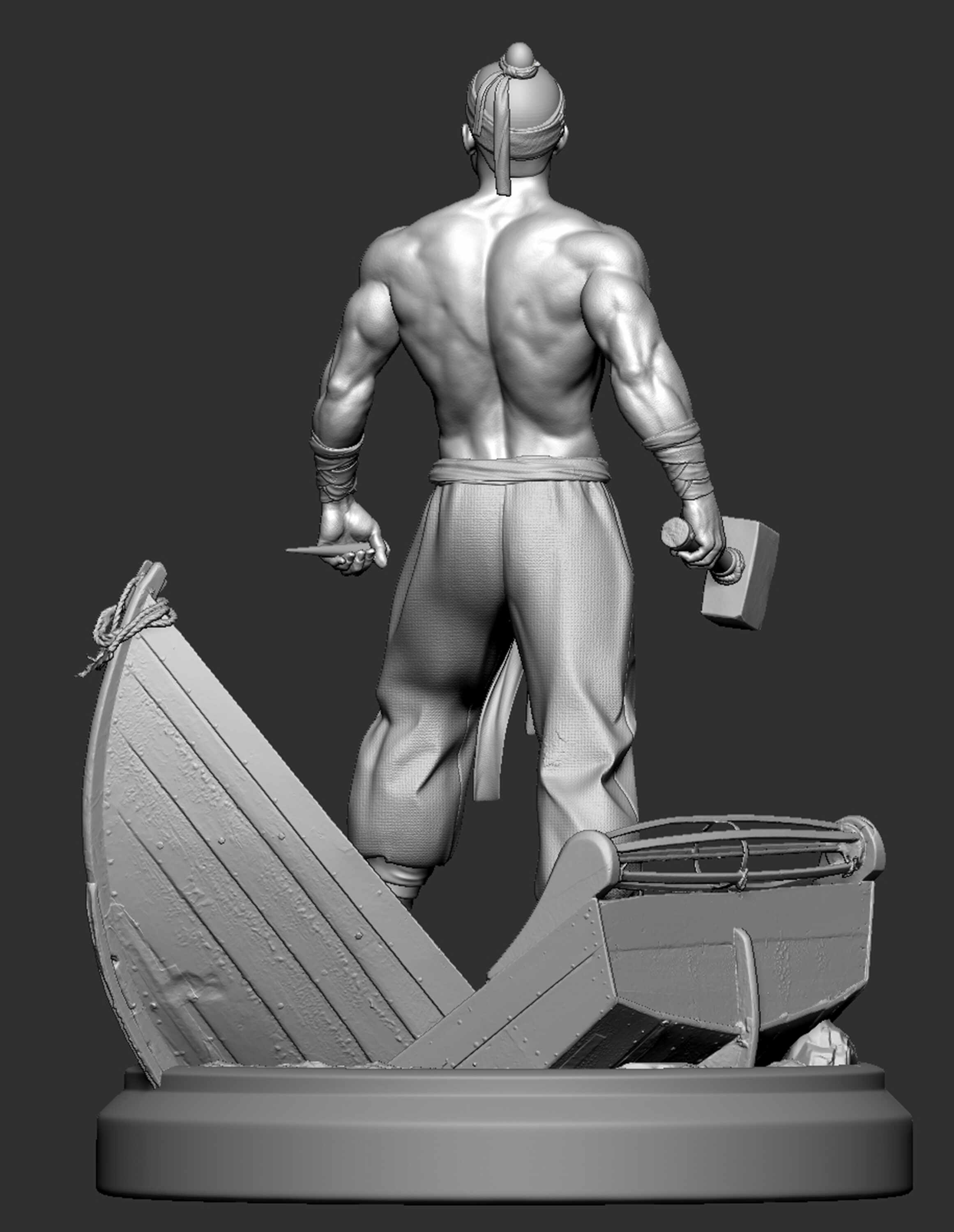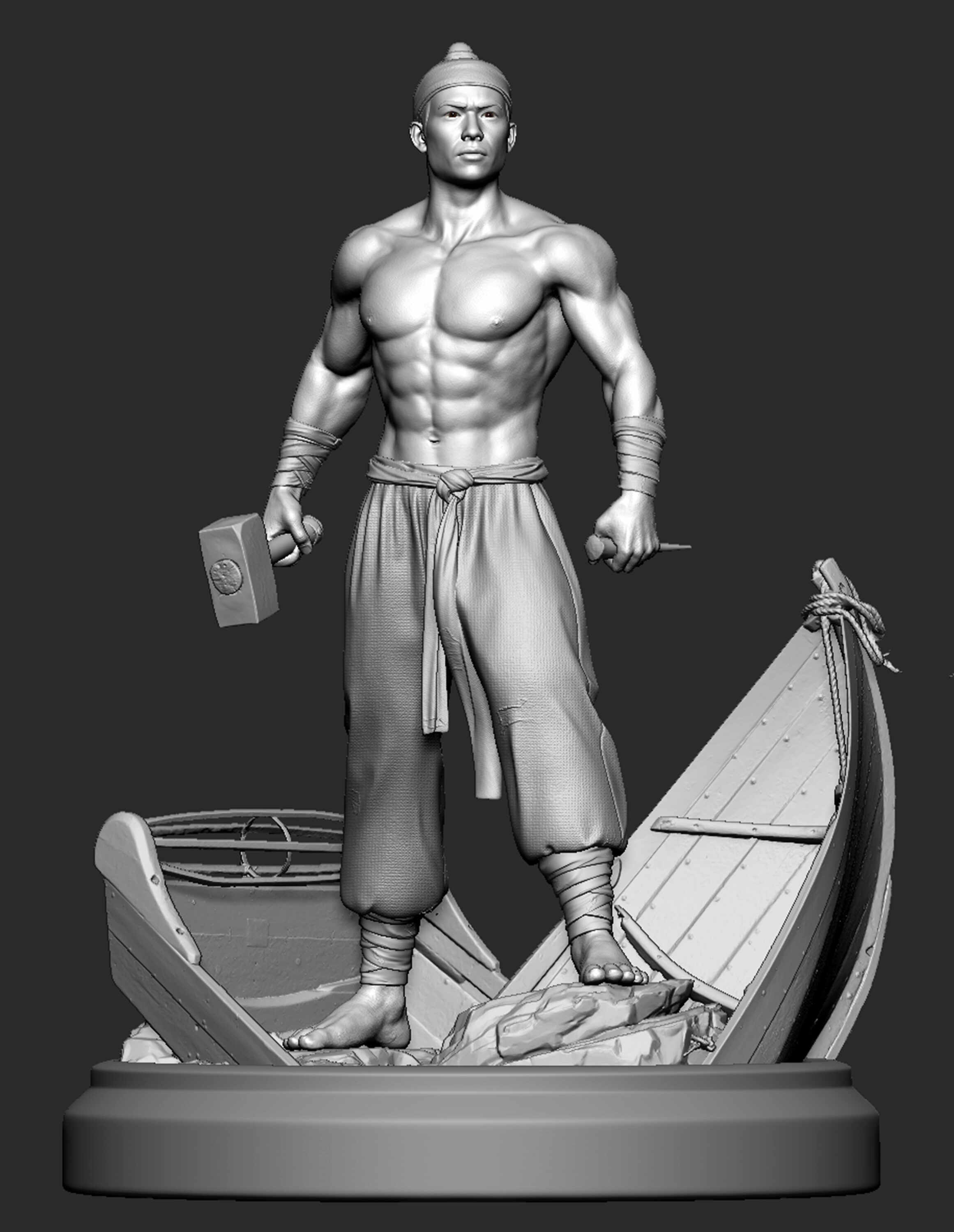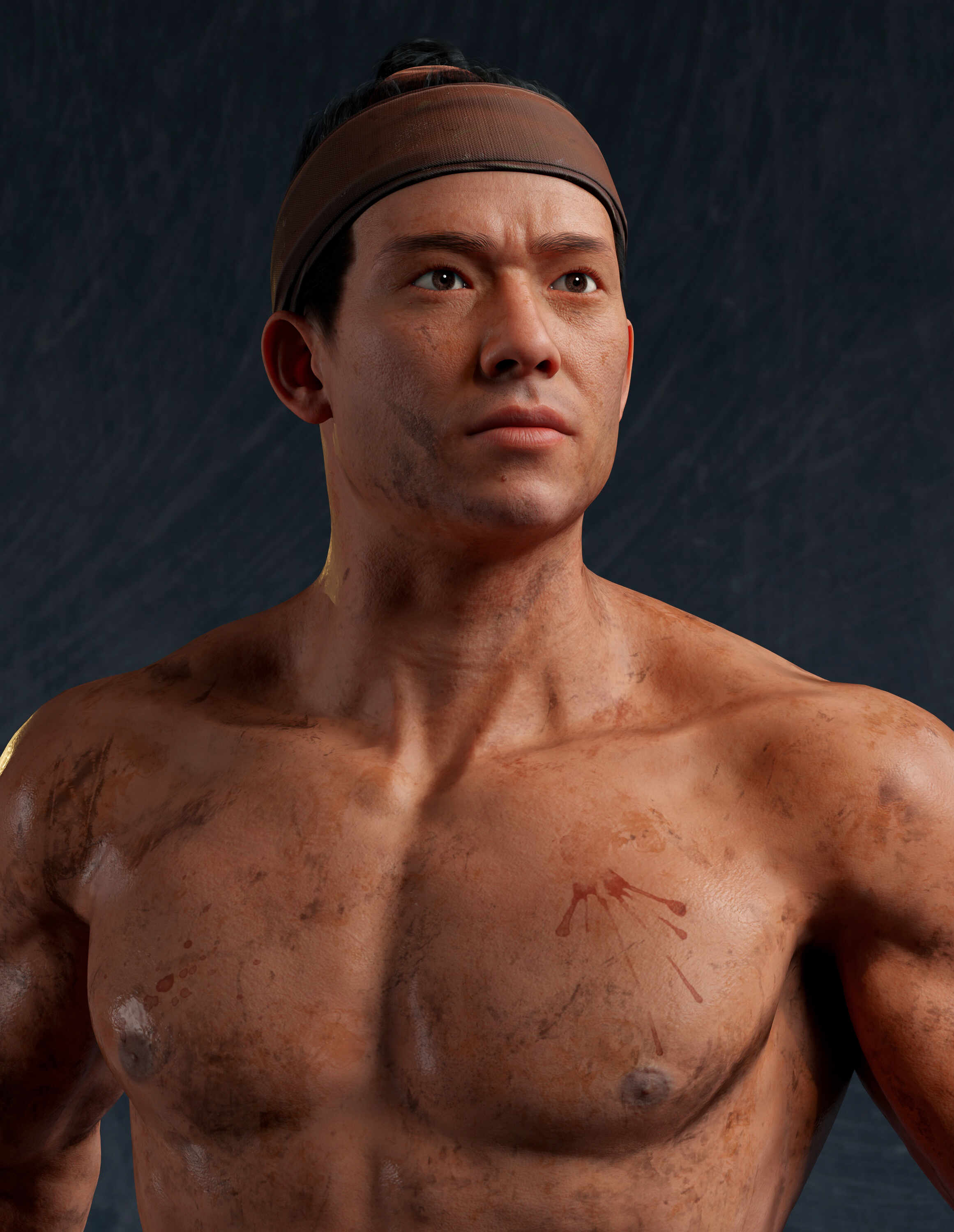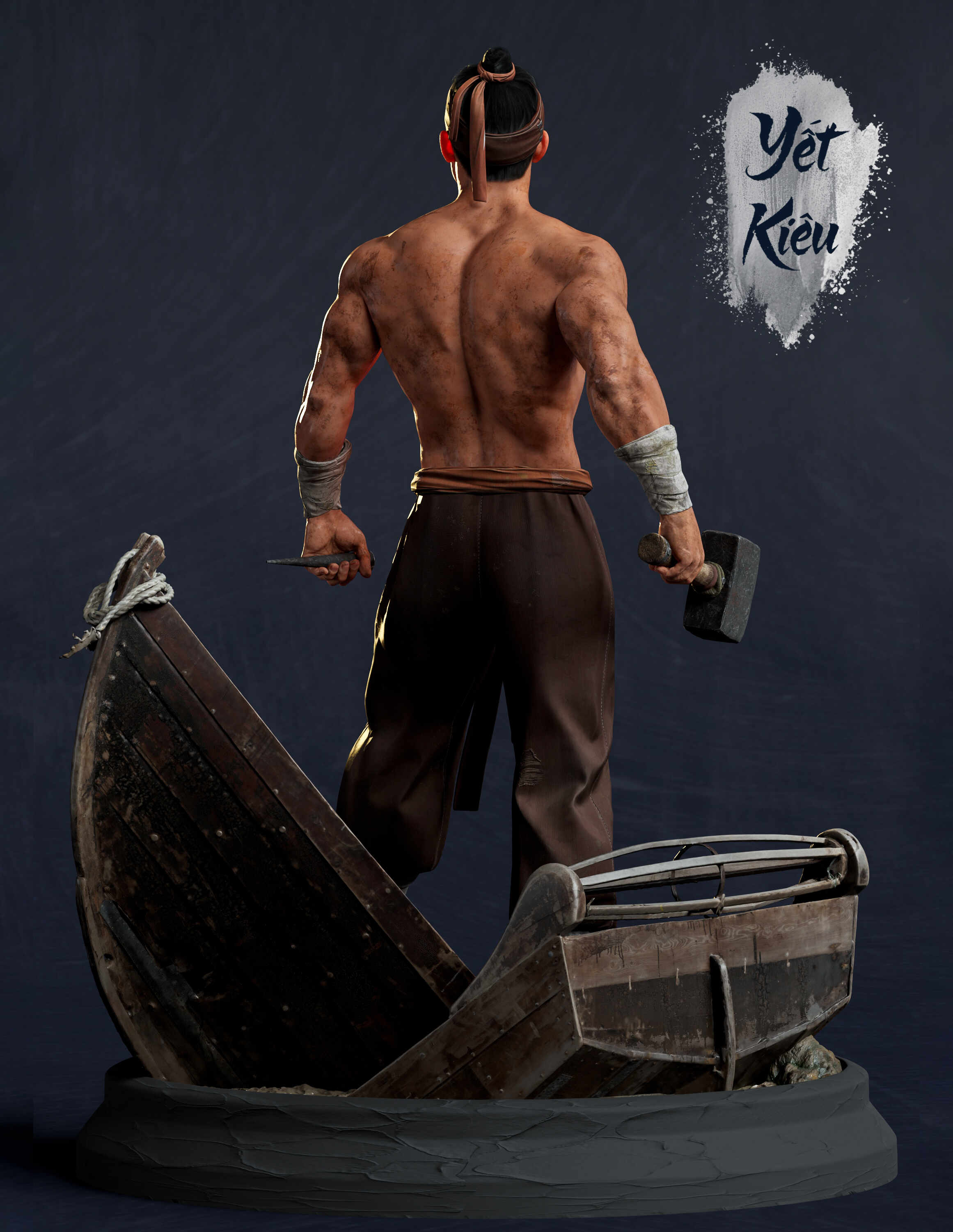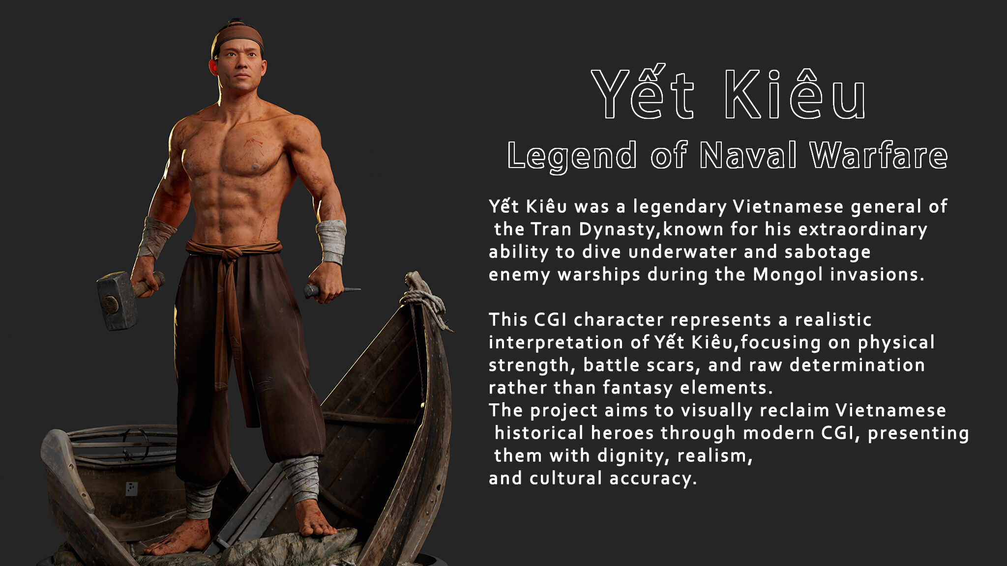 This CGI character represents a realistic interpretation of Yết Kiêu,focusing on physical strength, battle scars, and raw determination rather than fantasy elements.